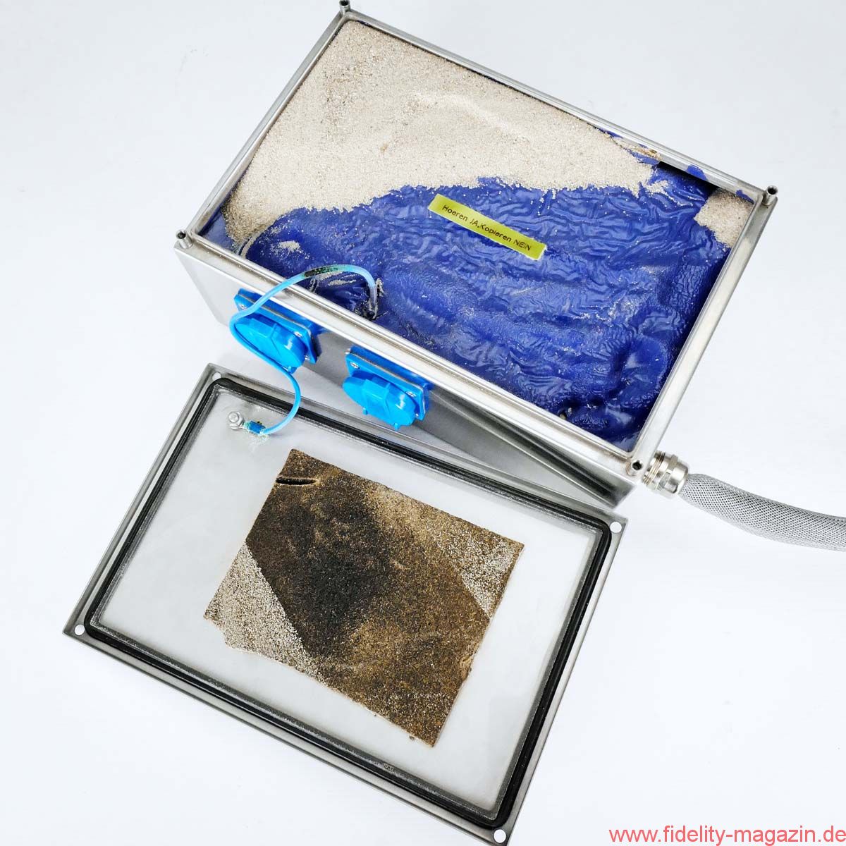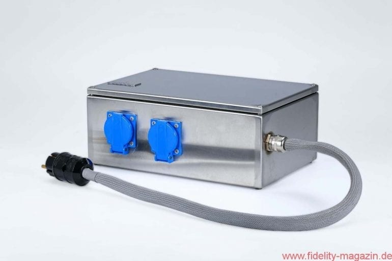 Als ich den Netzfilter aus der Verpackung wuchtete, dachte ich erst, es handele sich um eine Ersatzteil-Bestellung für meinen alten Citroen CX. Schwer, metallisch, leicht maschinenhaft duftend. Die Optik strebt asymptotisch ins Laborgerätehafte, bestenfalls Teutonische: eine schmucklose Metallkiste mit einem zahnsteinfarbenen Netzkabel und knallblauen Schukosteckdosen, die man eher der Schwerindustrie zuschreiben würde. Der PAF („Partner Acceptance Factor“) eines solchen Trumms dürfte sehr gering sein.