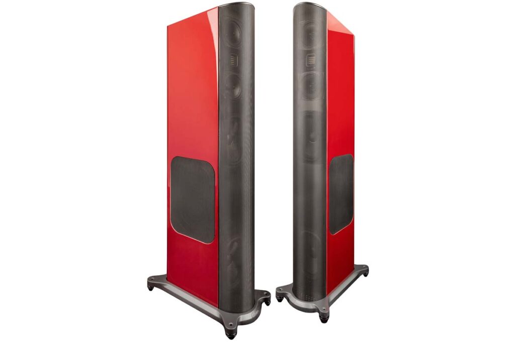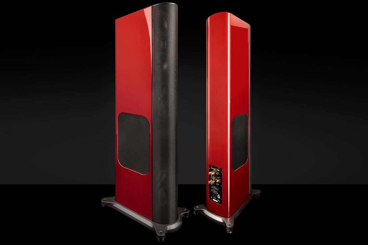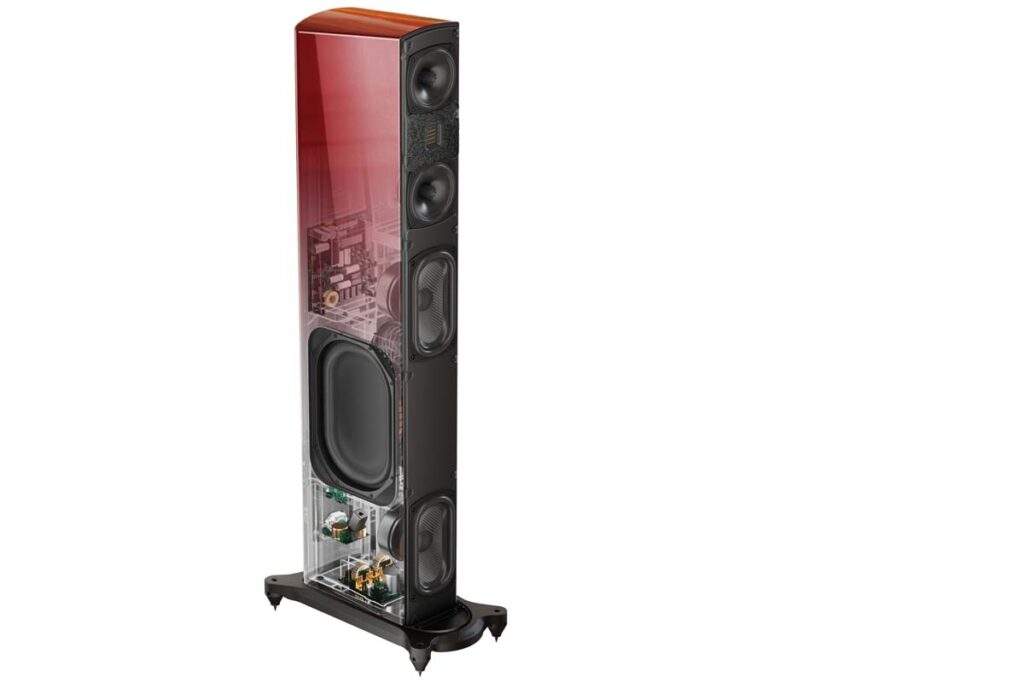 Auch akustisch wurde nochmals Hand angelegt und einiges optimiert. Mittel- und Hochton obliegt nach wie vor der bewährten Kombination aus dem AMT-Tweeter und zweien der ebenfalls bekannten 12-Zentimeter-Mitteltöner mit ihren charakteristisch geformten Diffraktionskegeln. Gespielt haben die Entwickler zudem mit der Positionierung der Basstreiber. Die beiden Chassis sitzen jetzt in einigem Abstand zueinander auf der Schallwand: Einer direkt unter der MTM-Gruppe, der andere wurde ans untere Ende gerückt. Die seitlich angeordneten Passivmembranen sitzen auf halber Höhe zwischen den aktiven Treibern. Durch diese Anordnung sollen die Radiatoren gleichmäßiger durch die rückwärtig abgestrahlten Bassanteile angeregt werden, wodurch sich höhere Effizienz und damit mehr Schalldruck erzielen lässt.