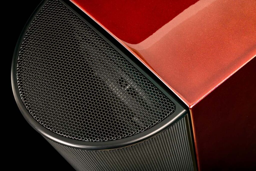 Das bisherige, vollständig stoffverkleidete Design passt hervorragend in diesen Tarnkappenansatz. Bei der neuen T66 hat AudioQuest jedoch wie eingangs erwähnt gegengelenkt. Der Anlass hierfür ist schlicht die Erkenntnis, dass sich ein Produkt, für das ein mittlerer vierstelliger Betrag fällig wird, deutlich von der Designästhetik einer Soundbar abheben muss. Am Ende hat man sich für das Beste aus beiden Welten entschieden und bei der Anmutung die Unauffälligkeit auf dem Altar eines wesentlich höheren Qualitätseindrucks geopfert. Neben dem effektvollen Meshgrill und dem vor allem in der Ausführung Santa Barbara Red zum Umfallen schönen Lackfinish äußert sich das in einer wesentlich komplexeren Fußkonstruktion als bisher. Der Vollaluminiumsockel verfügt nun auch über von oben per Inbus einfach verstellbare Spikes samt mit der bloßen Hand bedienbarem Konterring. Parkettbewohner können dabei dankenswerterweise auf Spikeschuhe verzichten, weil im Lieferumfang als Alternative zur starren Ankopplung auch Gummifüße beigelegt sind. Den gelungenen Formfaktor behielt man indessen bei und schlägt entsprechend weiterhin Kapital aus der Möglichkeit, die Treiberform dem gewünschten Gehäusedesign anzupassen und nicht umgekehrt.