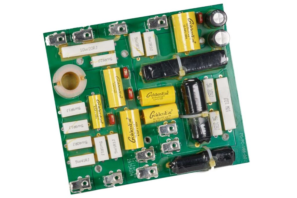 Auch die Frequenzweiche wurde gründlich überarbeitet, wobei man einigen Aufwand betrieben hat, um ein offeneres, transparenteres Klangbild zu erzielen. Im Hochtonzweig haben die Entwickler dem Kondensator einen kleinen, hochwertigen Bypasskondensator zur Seite gestellt – ein beliebter und überraschend effektiver Kniff, der ohne allzu große Zusatzkosten für eine erhebliche Klangsteigerung sorgen kann. Verzichtet hat man dagegen auf das bisher eingesetzte Zobelglied zur Impedanzkorrektur, das zwar dafür sorgt, dass der Lautsprecher leichter anzutreiben ist, laut Robert Hay von AudioQuest wegen der erhöhten Bauteilanzahl jedoch merklich Leben aus dem Klangcharakter saugt.