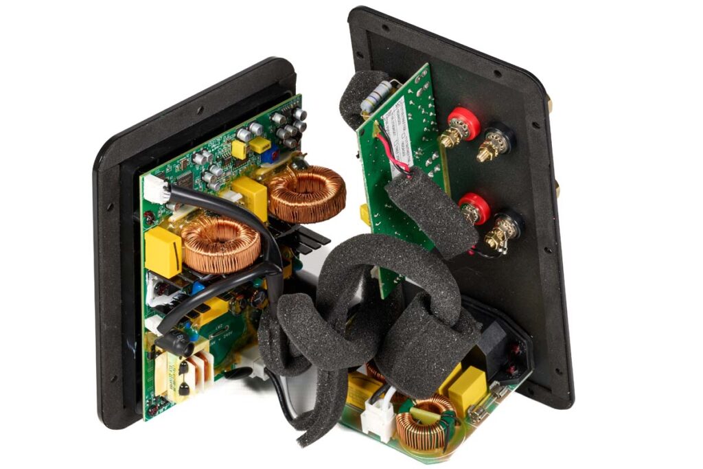 Stichwort „leicht anzutreiben“: Wie gehabt muss der Verstärker lediglich die Mittelhochtonsektion antreiben, den Bass versorgt eine interne, DSP-gesteuerte Class-D-Endstufe, die satte 500 Watt RMS abgeben kann. Auch wenn die T66 eine nominelle 4-Ohm-Last darstellt, fällt der Wirkungsgrad dadurch mit 91 Dezibel (2,83 V/1 m) gerade mit Blick auf das bescheidene Gehäusevolumen erfreulich hoch aus. Hay legt als Verstärker tatsächlich auch günstige AV-Receiver nahe.