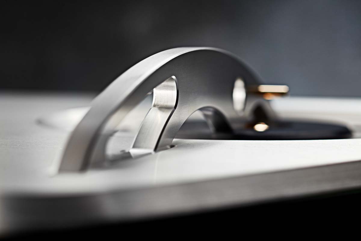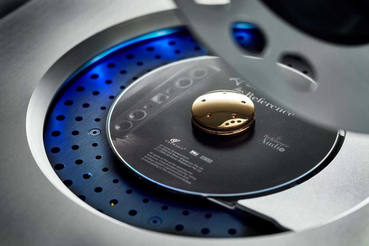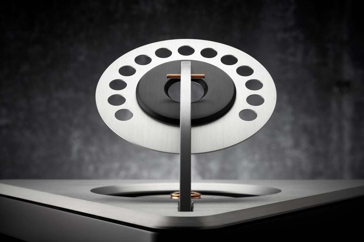 Während ich dem Quintett entspannt lausche, kann ich Ihnen noch ein paar technische Eckpunkte mit auf den Weg geben. Das dreieckige Gehäuse findet aufgrund seiner Standardbreite von 48 Zentimetern so gut wie auf jedem Rack Platz. Dort kann der CD-Spieler mithilfe der beiliegenden Dosenlibelle und den drei höhenverstellbaren Füßen schnell „ins Wasser gestellt“ werden. Den beiliegenden runden Untersetzer aus Leder platziere ich auf der massiven, 4 Millimeter dicken Aluminiumplatte, um hier beim Wechsel des Mediums den magnetischen Puck ablegen zu können. Dieser fixiert die CD im Abspielbetrieb auf der Spindel des Stream-Unlimited-Laufwerks (CD-Pro8 S-Transport). Damit spielt der Gryphon ausschließlich CDs im Red-Book-Standard ab, SACD oder andere Disc-Formate sind dem Dänen fremd, und sie spielen ehrlich gesagt ja auch kaum eine Rolle. Allerdings – auch gebrannte CDs laufen nicht immer problemlos.