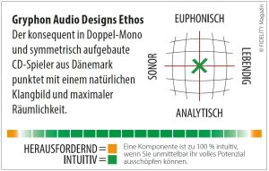 Den magnetischen Puck auf die CD gesetzt, den soliden Deckel abgesenkt und die Starttaste auf der Front gedrückt: So leicht und schnell kann der Weg zu musikalischem Genuss sein. Der dänische Toploader Gryphon Ethos weist mit der edlen Haptik und klaren Benutzerführung auf das hin, was wohl aus den Ausgangsbuchsen kommen wird.