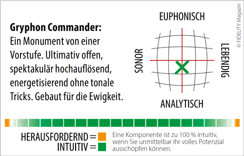 Die Gryphon Commander ist ein Monument von einer Vorstufe. Ultimativ offen, spektakulär hochauflösend, energetisierend ohne tonale Tricks. Gebaut für die Ewigkeit.