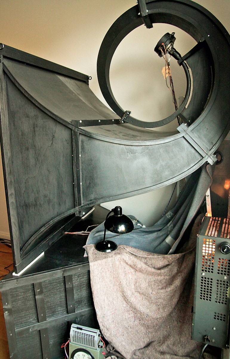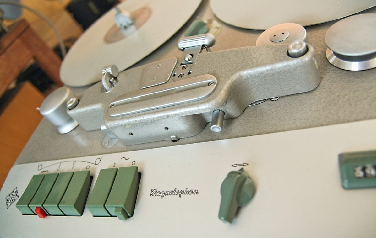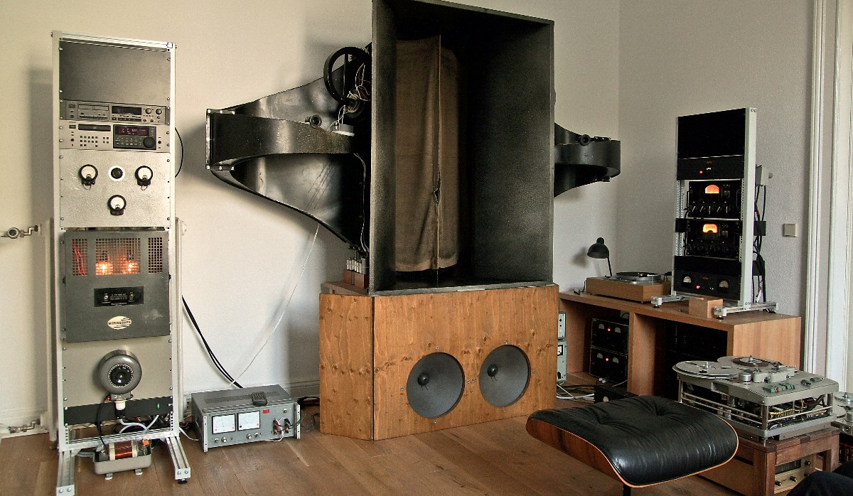 Bei “Mr. WE” wird der Gast zunächst in den mittleren von drei großen, untereinander verbundenen Räumen geleitet. Die Einrichtung ist sparsam klassisch-modern, ein Pärchen gut hüfthoher Hornlautsprecher des Typs Altec Voice of the Theatre fällt ins Auge. Aus dem linken Zimmer dringt mächtig und dunkel Johnny Cash durch die geschlossene Tür – es ist Besuch da, Vater und Sohn auf dem Weg zum Horn, auch sie folgen einer Einladung. Also nach rechts ins Büro. Dort, direkt vor der Wand, erhöht auf einem selbst gebauten Bass-Sockel platziert: ein Doppelhorn Western Electric 16A – Metallkonstruktion, extraflache Geometrie, damit es hinter Kinoleinwände passt. In der linken Zimmerecke: ein übermannshohes Gestell mit digitalen Zuspielern (der Hausherr ist da undogmatisch) und Netzteilen für die Elektromagnete der fremderregten Lautsprecherchassis. In der rechten Zimmerecke: Ein kleineres Gestell mit modifizierten WE-Mikrofonverstärkermodulen WE22D, daneben eine analoge Tonquelle, ein englischer Garrard-Plattenspieler des Typs 301 mit Reibradantrieb, eingebaut in eine hübsche neue Holzzarge. Das Horn zielt auf einen keine drei Meter davor stehenden Eames-Chair. Neben diesem in Griffweite finden sich zwei weitere analoge Zuspieler, Telefunken-Magnetophone M5, einmal als röhrenbestückte Mono-Version, einmal als transistorisierter Stereo-Typ.