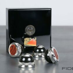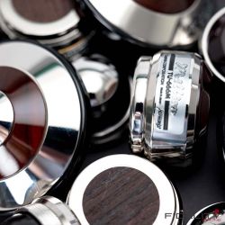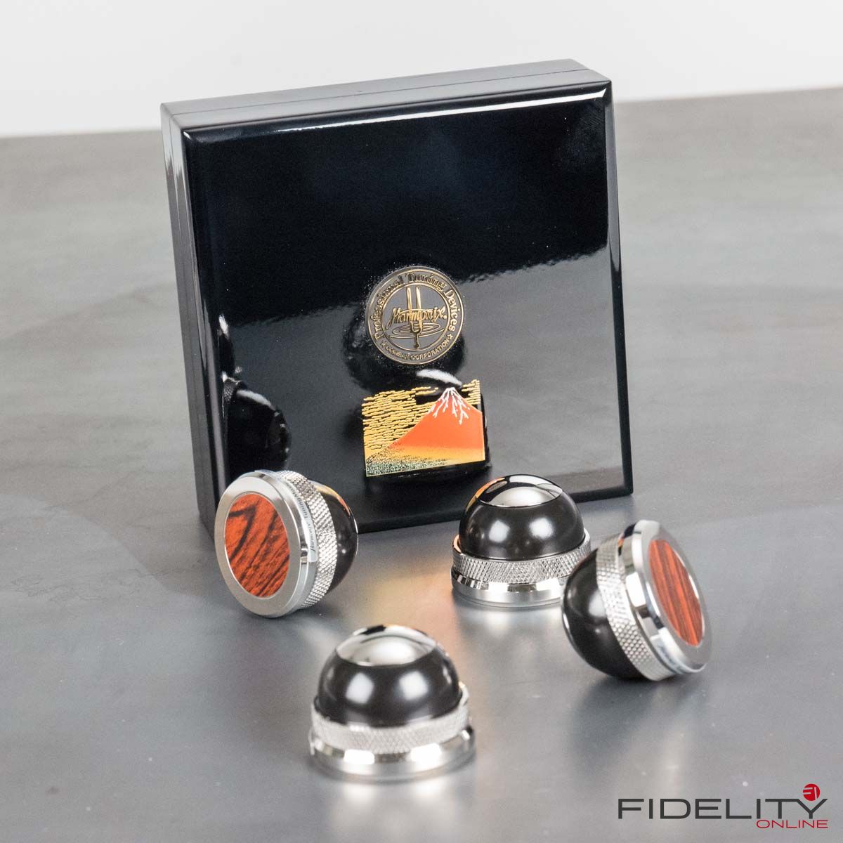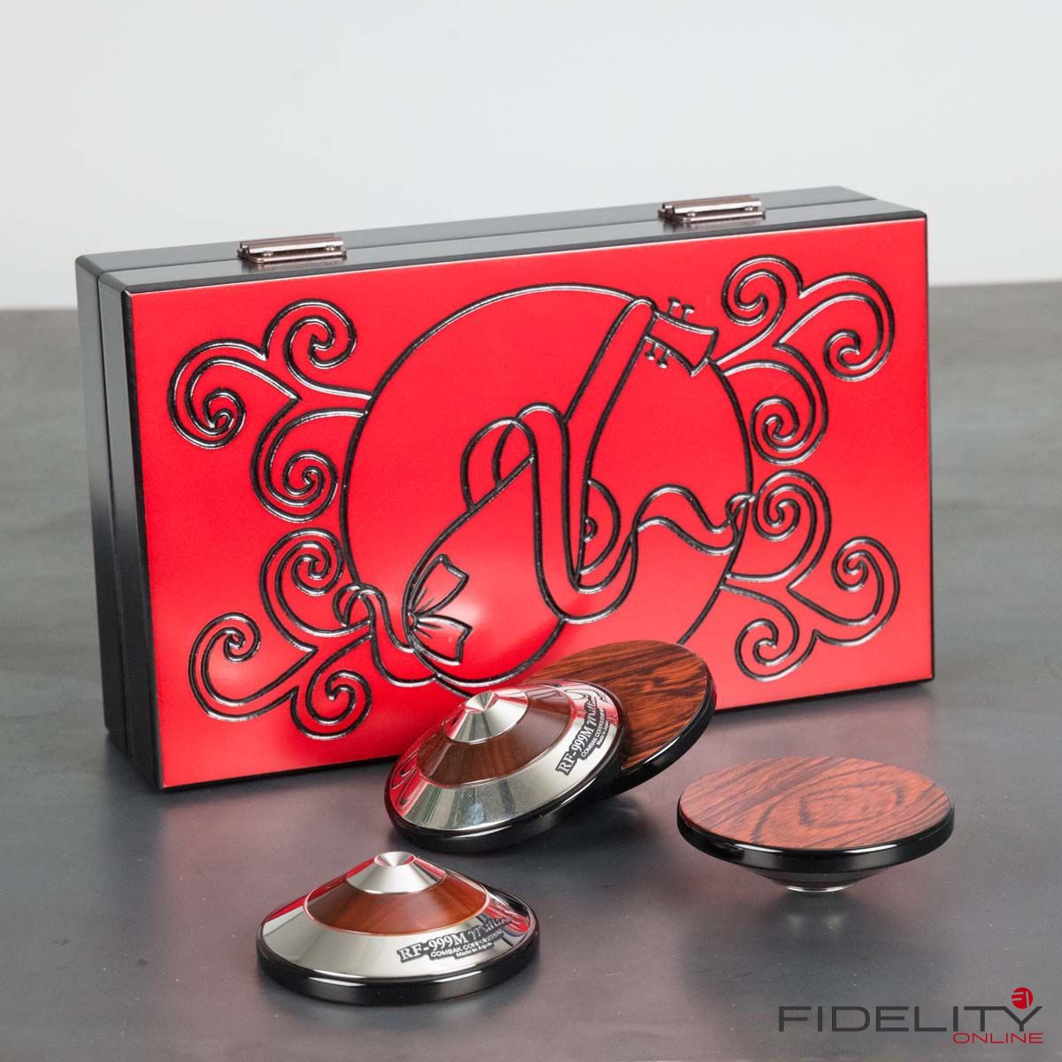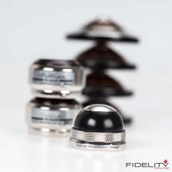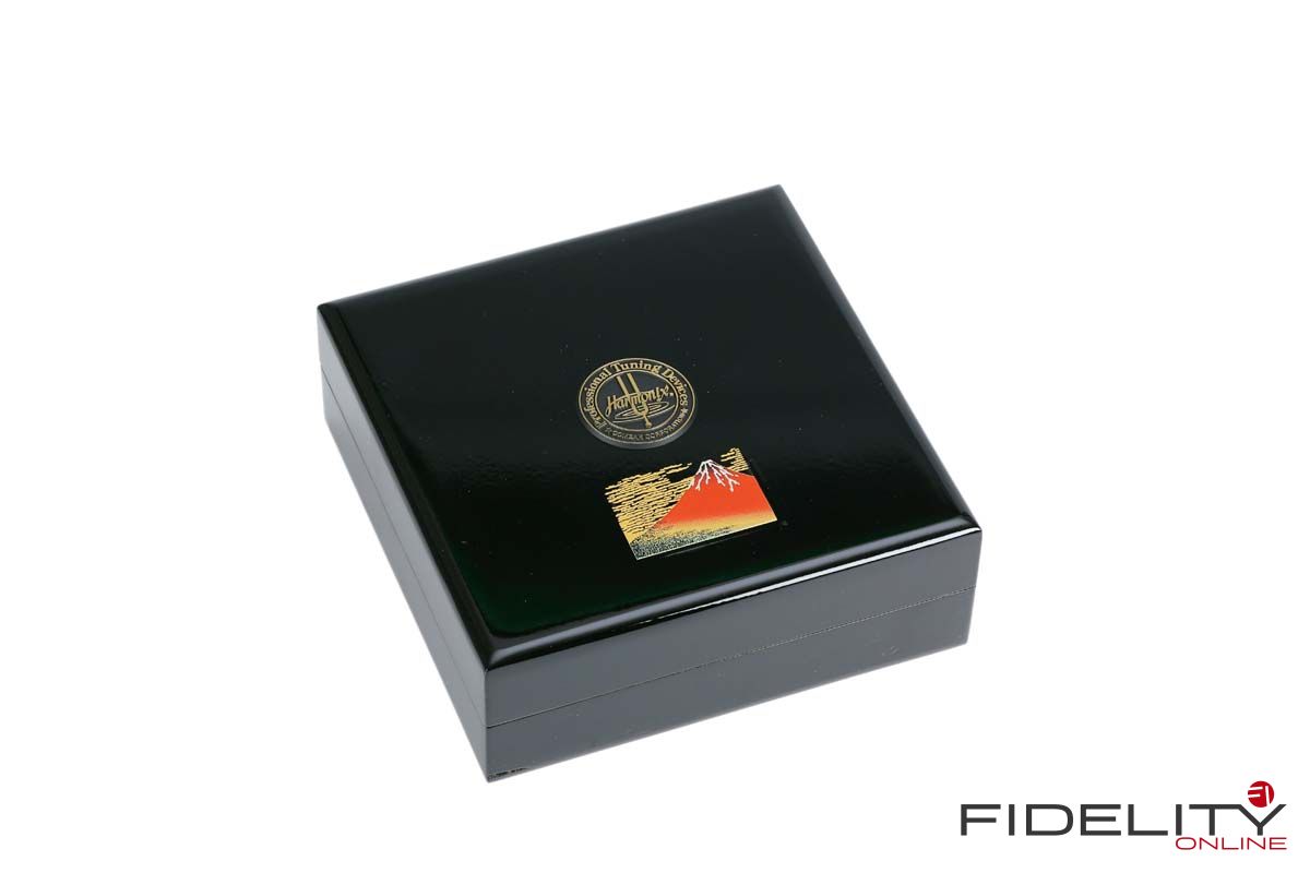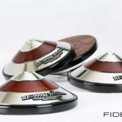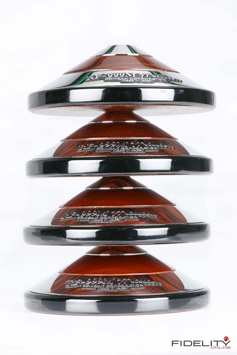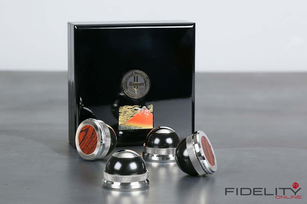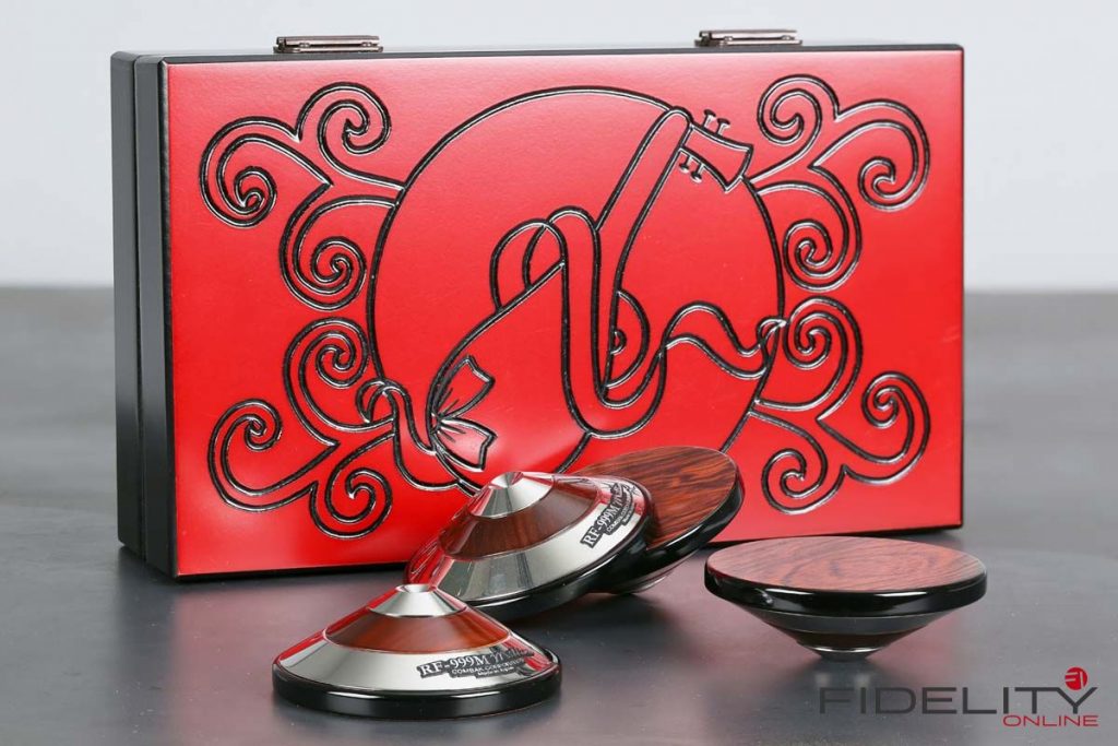 Zum Einstieg ins Thema sitze ich im FIDELITY-Hörraum vor einer ziemlich schweren Kiste und freue mich wie ein kleines Kind. Ich darf jetzt auspacken. Der großen Kiste entnehme ich viele kleinere Päckchen, darin noch mehr kleine Kartons, in denen die offensichtlich kostbaren „Tuning Devices“ einzeln verpackt ruhen. Nach einer geschlagenen Dreiviertelstunde „unboxing of Harmonix devices“ bin ich umgeben von hauchzarten Papierchen, sanften Stoffhüllen und samtenen Schatullen sowie einem halben Dutzend feiner Japanlack-Schachteln. Das sorgfältig aufgereihte Millionärs-Treffen umfasst 16 halbkugelige RS-1502M und acht etwas größere Scheiben vom Typ TU-666M, die als Gerätebasen dienen werden, sowie acht prachtvolle „Unterstellkegel“ (Tuning Spike Base) namens RF-999M. Sofortiges Ausprobieren ist angesagt.