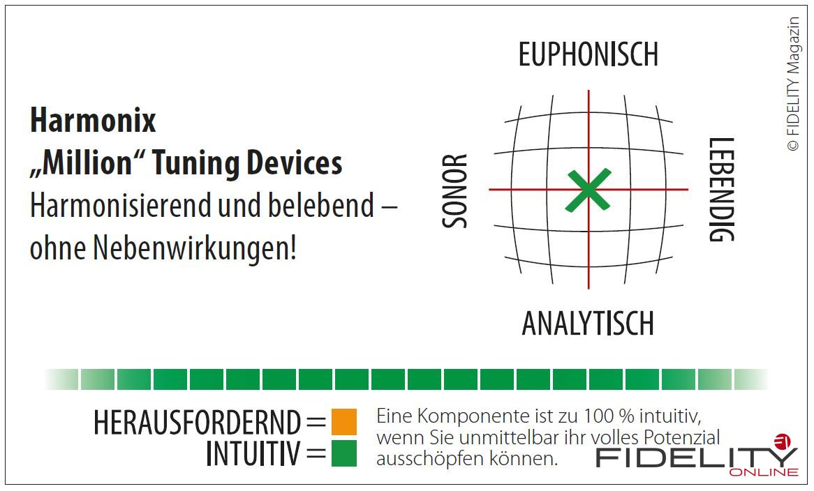 Ja, auch so gesehen bin ich natürlich gern dauerhaftes Mitglied im exklusiven „Million“-Club. Wenn Ihnen der Mitgliedsbeitrag zu hoch erscheint oder die auszustattende HiFi-Anlage preislich nicht recht zum Zubehör passen will, bietet das Harmonix-Portfolio ja auch deutlich preisgünstigere Eintrittskarten.