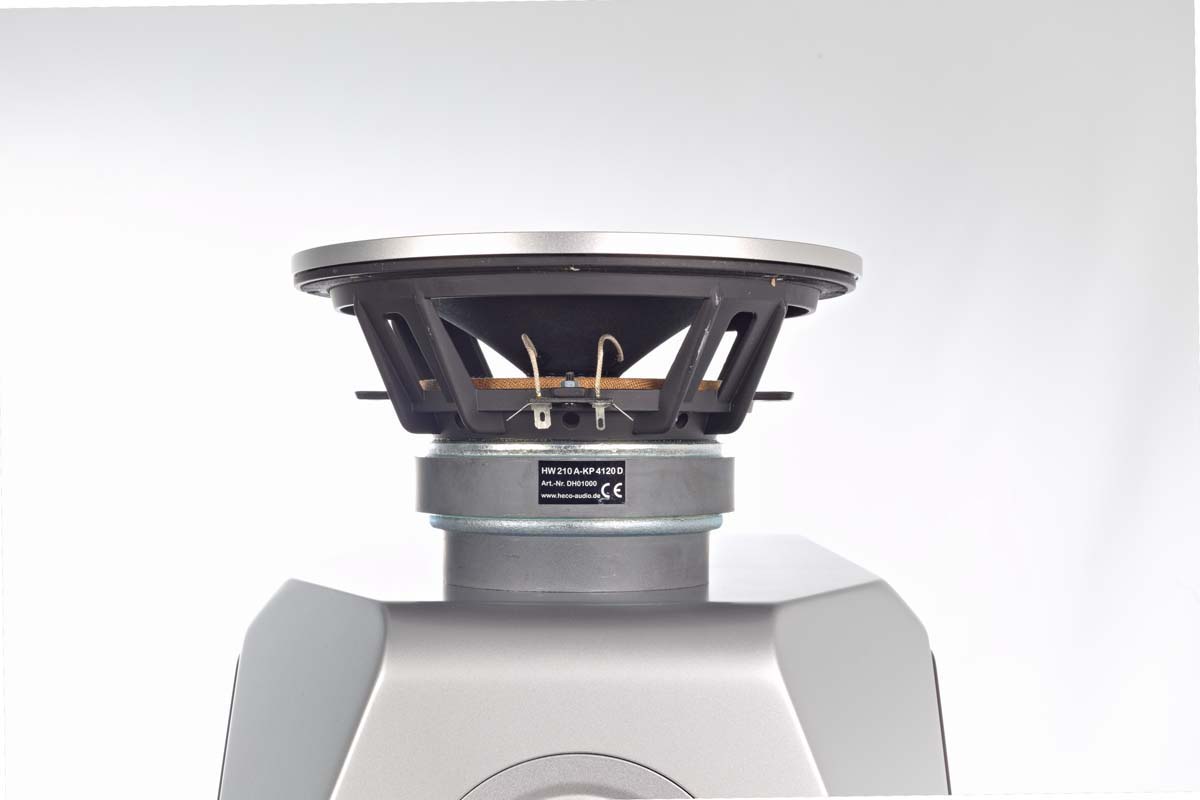 • Der mithilfe eines Klippel-Systems verfeinerte Basstreiber verfügt über eine große Antriebsspule mit 32 mm Durchmesser. Damit reicht seine lineare Basswiedergabe bis 34 Hz hinunter, insgesamt (−6 dB) kommt die Box auf 28 Hz.