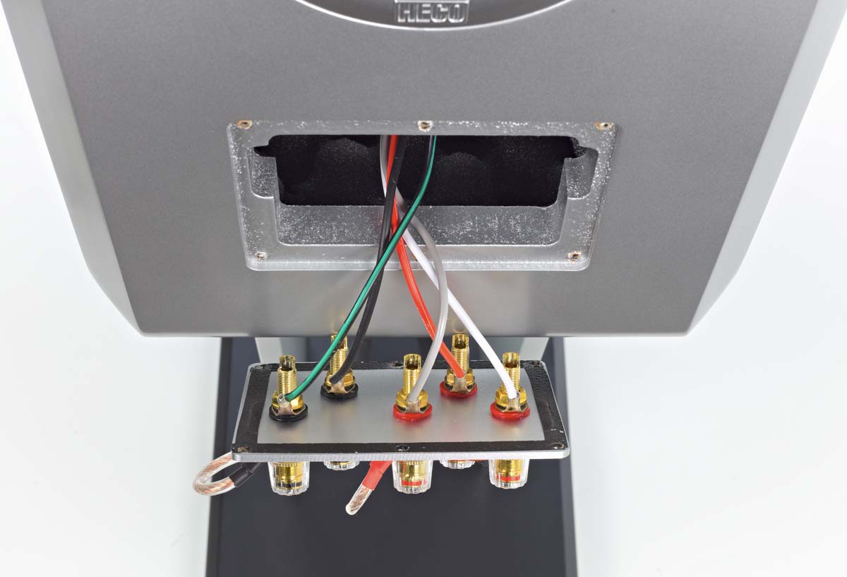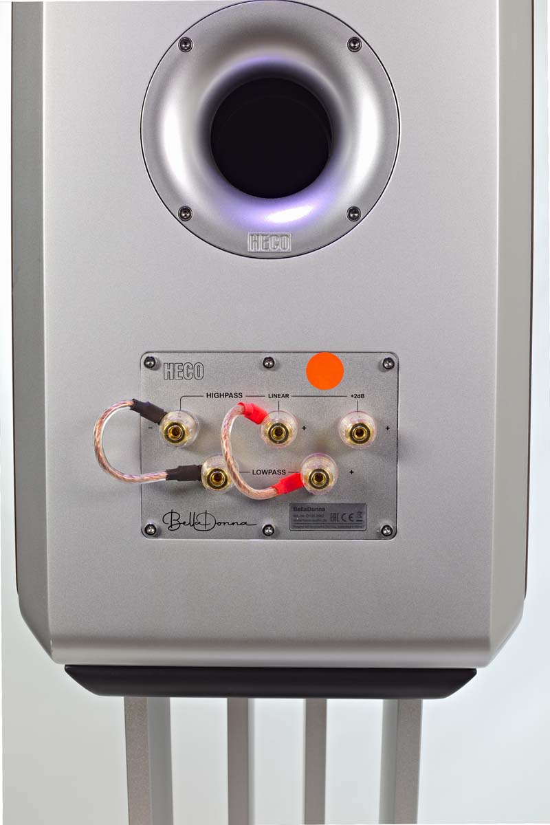 • Die rückseitige Bassreflexöffnung und das Anschlussterminal erlauben eine dezente Anpassung an den Hörergeschmack und den Raum. Mit der Verringerung des Wandabstands kann man den Bass merklich verstärken. Ein alternativer Hochtonanschluss hebt die Höhenpräsenz um 2 dB an. Mit etwas Fingerspitzengefühl kann man der ansonsten extrem linearen Abstimmung der BellaDonna einen Hauch von Loudness-Charme spendieren.