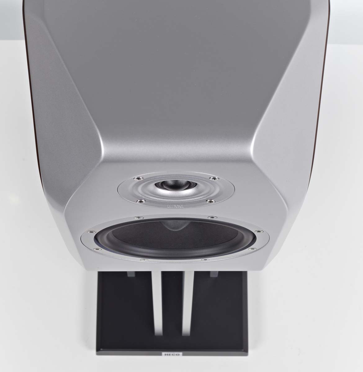 • Der 30-mm-Hochtöner aus Seide wurde völlig neu entwickelt. Er sitzt im Zentrum einer Waveguide-Einfassung, die Heco als „Fluktus-Schallwand“ bezeichnet.