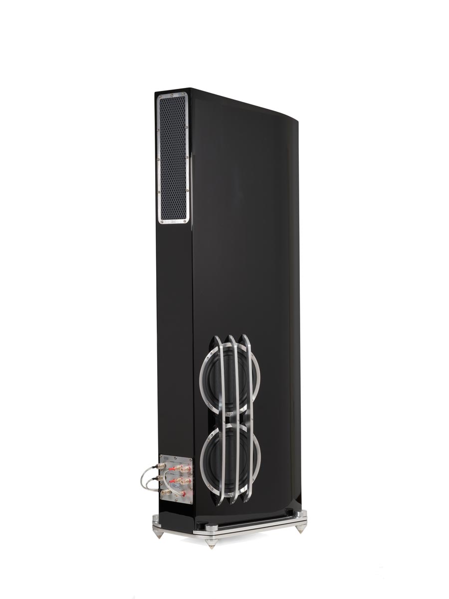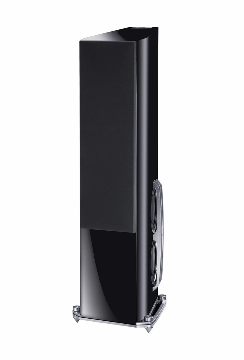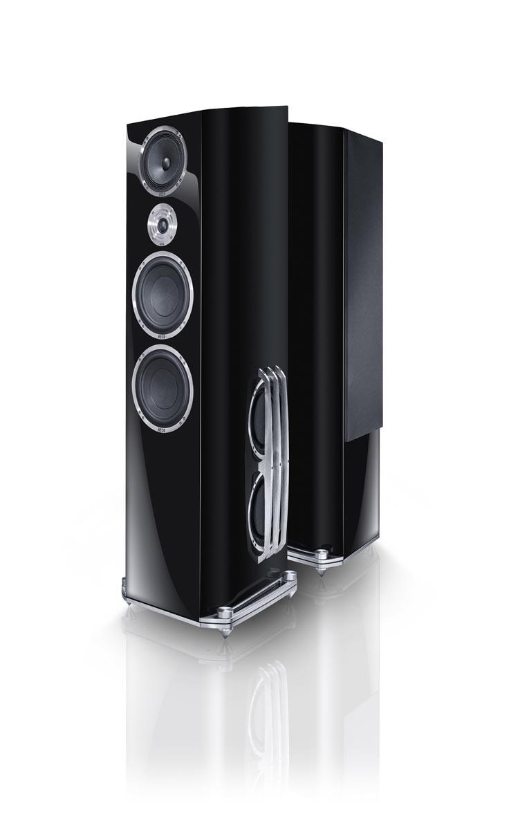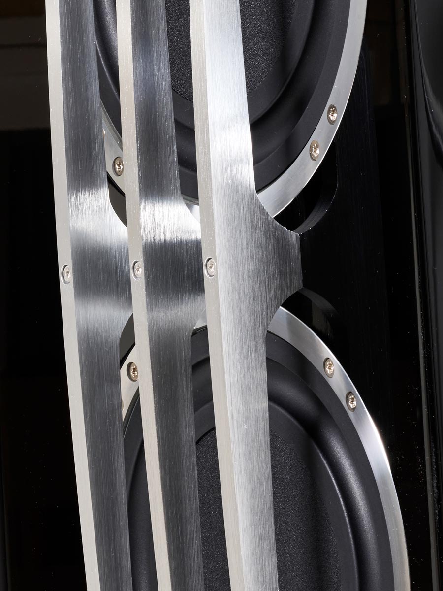 Im Kontrast zum Kraftpapier-Treiber kommt der „Fluktus“-Tweeter als Hightech-Konstruktion daher. Mit einem Durchmesser von 30 Millimetern fällt die Kalotte aus Polyfiber-Compound sichtlich größer aus als viele ihrer Standesgenossen. Außerdem ist sie in einen breiten Aluminiumring eingebettet, dessen sanft gewellte Struktur die Abstrahlung verbreitert. Der federleichte Treiber kann Frequenzen bis über 50 Kilohertz reproduzieren, was der Diva extremes Auflösungsvermögen und eine unvergleichliche Transparenz verleiht. Ihren kristallklaren Höhen entgeht nicht das kleinste Detail. Zudem bilden die crispen und doch so geschmeidigen Höhen genau den richtigen Gegenpol zum stattlichen Fundament.