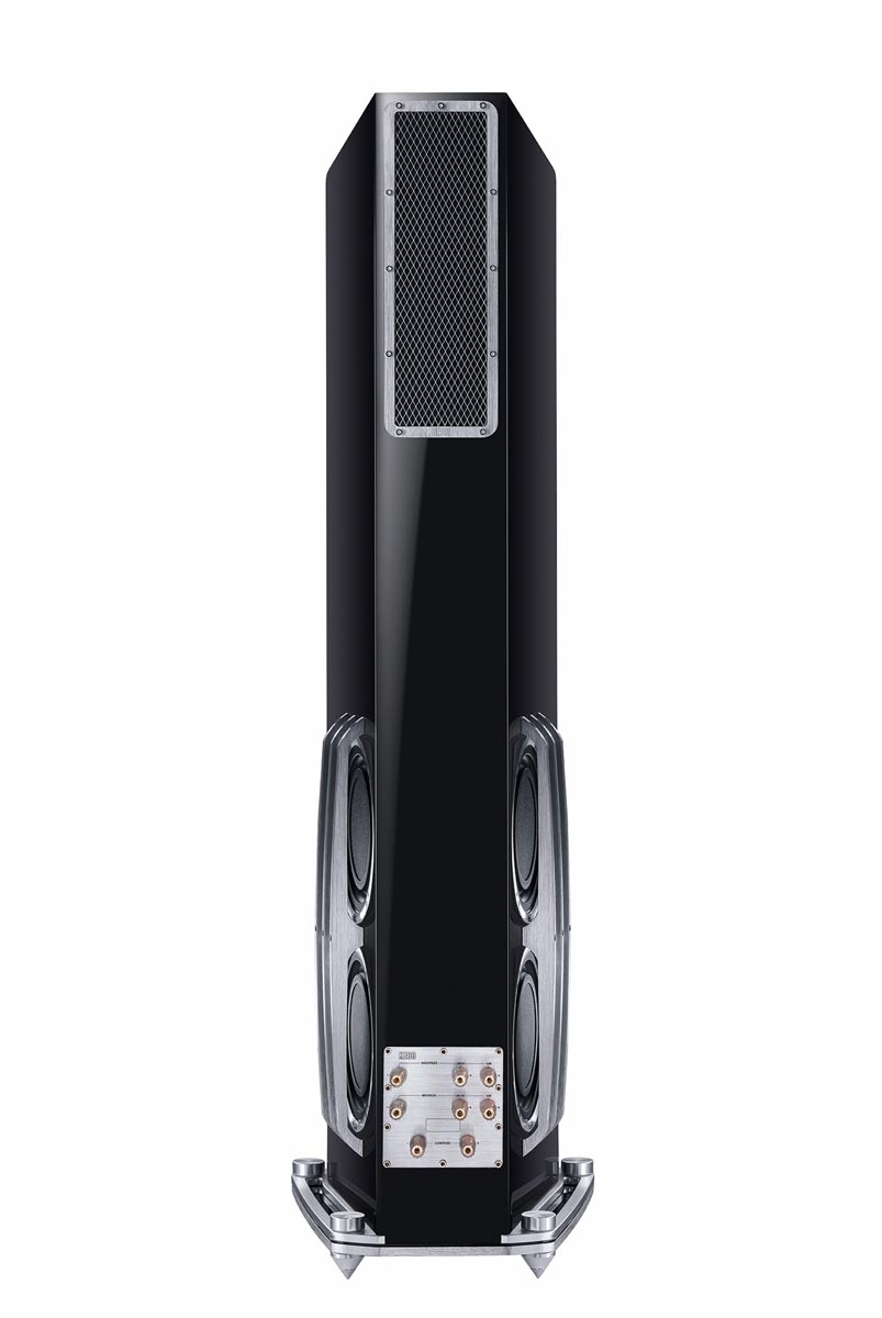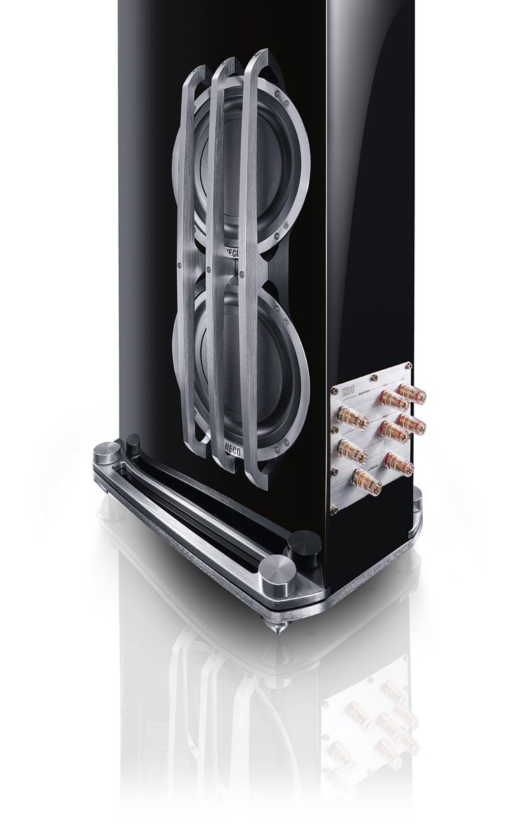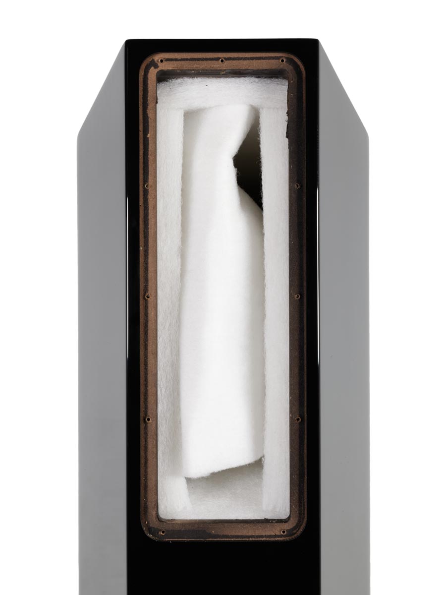 sowie Resonanzarmut und vermeidet stehende Wellen. Im oberen Gehäusesegment dient eine der Verstrebungen zugleich als Raumteiler: Da der Mitteltöner unbeeinflusst von den Bässen arbeiten soll, sitzt der Mitteltöner in einem eigenen, nach hinten halboffenen Volumen. Ein Gitter an der Rückseite, das mit einem dichten Gewebe bedämpft ist, verrät den Kniff.