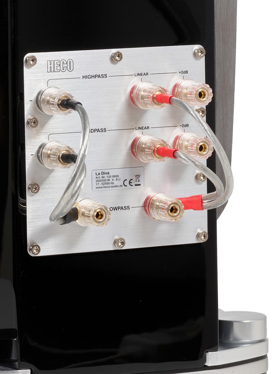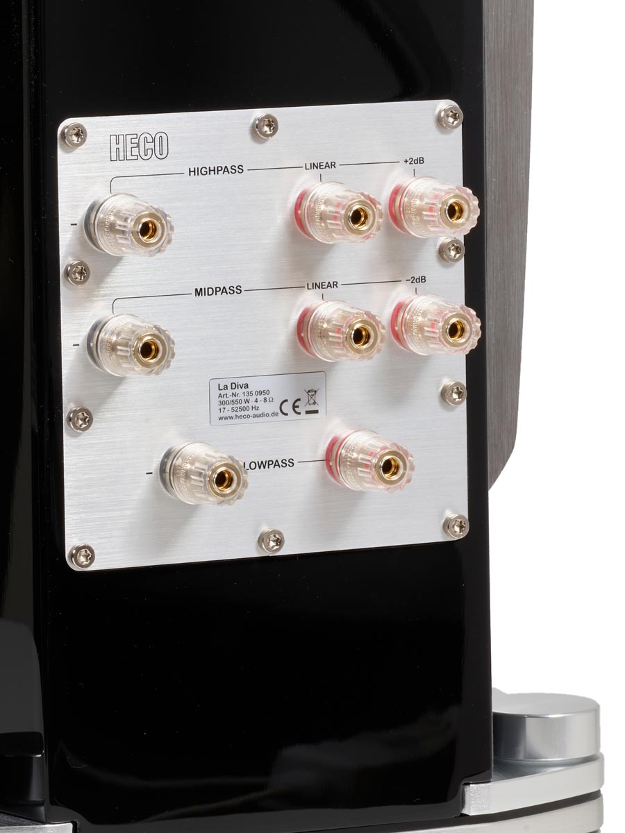 Das heißt … erstmal mussten wir sie natürlich anschließen. Wie von den früheren Topmodellen der Pulheimer gewohnt, bietet das Tri-Wiring-Terminal verschiedene Optionen. Die Höhen lassen sich neutral oder um zwei Dezibel angehoben einstellen, während die Mitten um zwei Dezibel abgesenkt werden können. So kann man dem Heco-Flaggschiff einen Hauch mehr an Transparenz verleihen oder die Stimmpräsenz dezent absenken, sollte man es beispielsweise im Surround-Setup gemeinsam mit einem Center betreiben. Bei uns lief die Diva freilich neutral, einen Mangel an Klarheit und Auflösung konnten wir zu keinem Zeitpunkt beklagen.