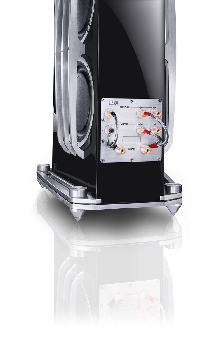 Terminal: Tri-Amping mit separaten Zugängen für +2 dB Höhen, −2 dB Mitten