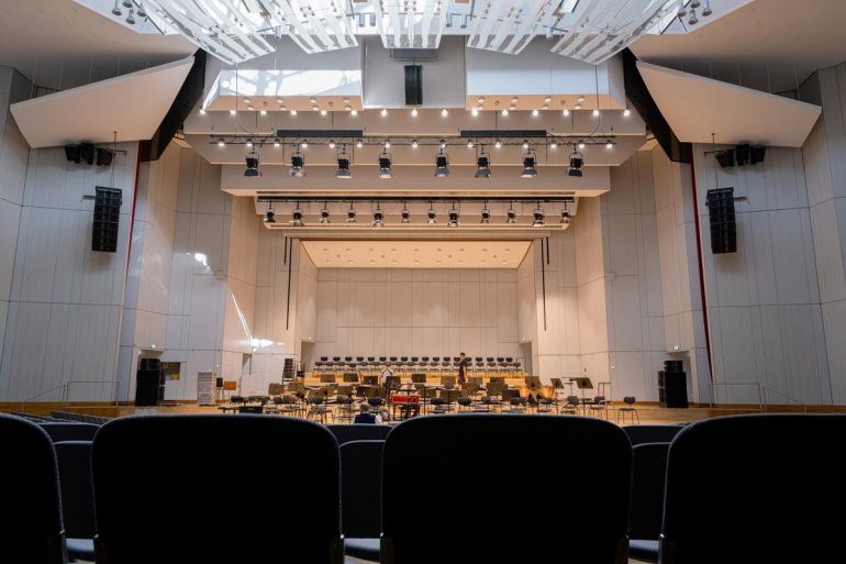 Die Bühne erreicht man per Fahrstuhl oder über breite Treppen. Ist man endlich auf der vielfach einstellbaren Bühne angekommen, fühlt man sich sofort wohl: der Saal mit dem Grundriss eines unregelmäßigen Siebenecks baut relativ hoch, dafür nicht sehr lang, zwei Ränge übereinander sorgen dafür, dass auch die hintersten Reihen nie wirklich weit weg sind. Es wirkt intim, freundlich, der Kontakt zum Publikum stellt sich sofort ein, und man glaubt nie und nimmer, dass man 2000 Menschen gegenübersitzen soll. Damit der Schall nicht in der hohen, zeltartigen Decke verschwindet, sorgen mehrere durchsichtige Segel für die ausreichende Reflexion, alle Töne bleiben also nah bei uns, wirken griffig und definiert. Durch die sehr diffus streuende Charakteristik des siebeneckigen Grundrisses kommt es auf der Bühne glücklicherweise nie zu Phantomschallquellen. Oft erlebt man es, dass man Kollegen beim Spielen aus allen möglichen Richtungen hört. Nur nicht dort, wo sie sitzen. Die Raumhöhe sorgt gleichzeitig für das nötige Maß an Bindung, sodass musikalische Linien in der auf Sprache optimierten Akustik nicht auseinanderfallen.
