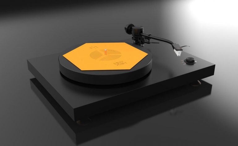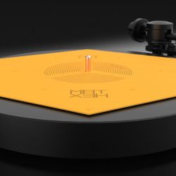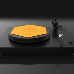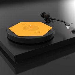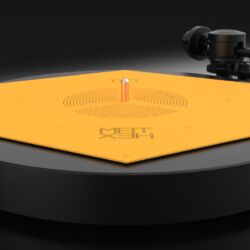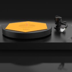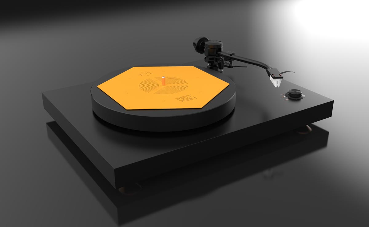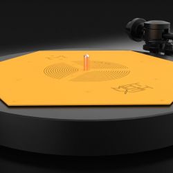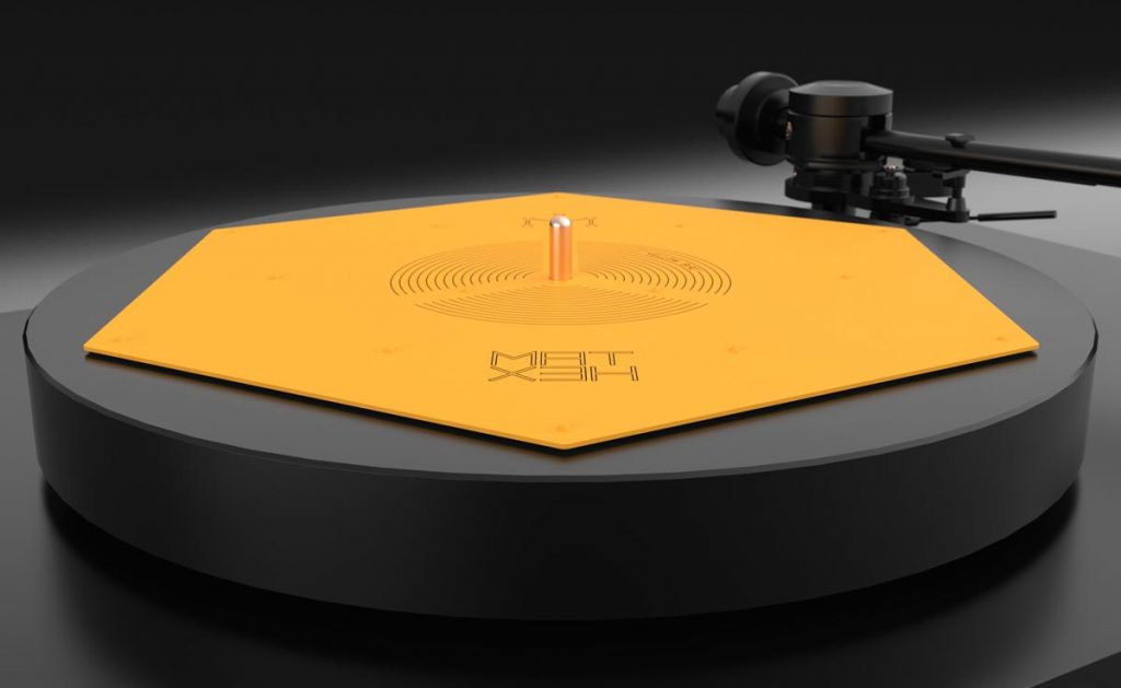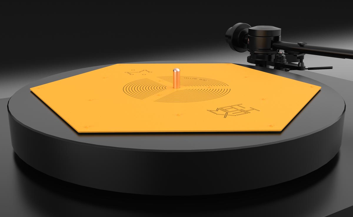 Das flache blassgelbe Hexagon hat der ungarische HiFi-Ingenieur Zsolt Fajt entwickelt. Seine Einsicht: Gerade bei der Schallplatte mit ihrer mikroskopisch feinen „Datenspeicherung“ ist eine effiziente Vibrationsvermeidung bzw. -ableitung essenziell für den guten Klang. Kein Widerspruch an dieser Stelle.