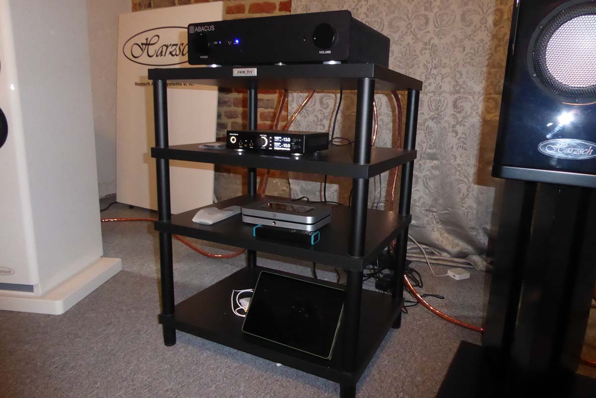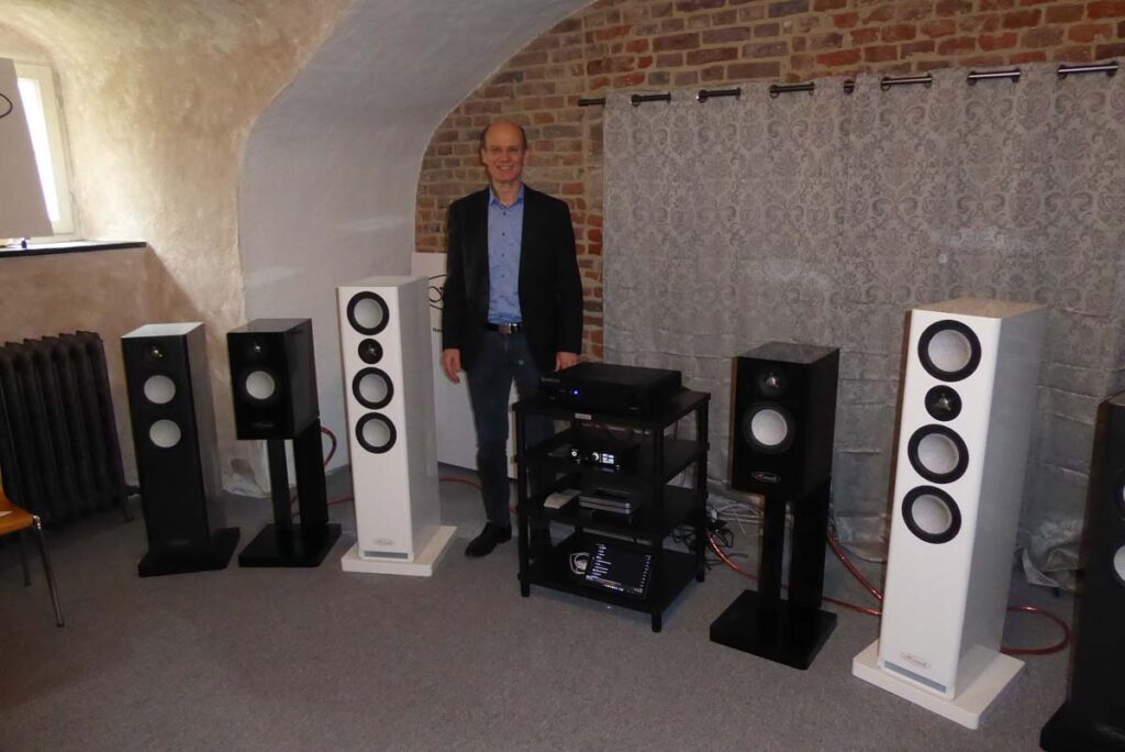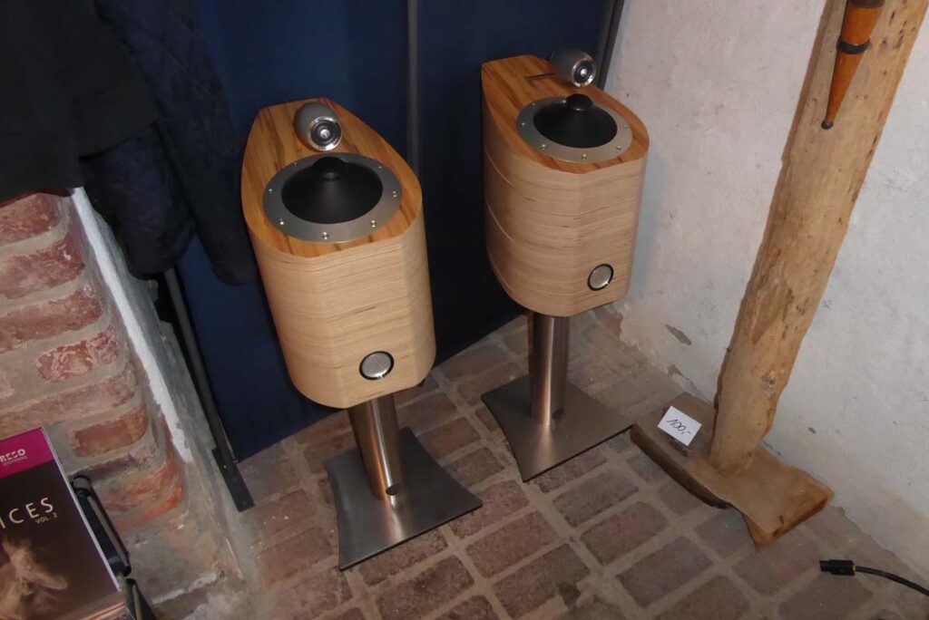 Meinen Besuch des Nordflügels verschob ich, da dieser vollkommen überlaufen war und tauchte ab in das Kellergewölbe. Dort wurde ich überrascht von einer mir bis dahin vollkommen unbekannten Lautsprecher-Manufaktur aus Castrop-Rauxel. Inhaber und Entwickler Oliver J. Harzsch präsentierte seine komplette Serie, bestehend aus einer Kompaktbox und zwei Standlautsprechern. Den Zweieinhalbwege-Bassreflexlautsprecher “Concert“ führte er mit einem Blue-Note-Streamer, RME-DAC und Abacus-Verstärker vor. Die Lautsprecherkabel kamen von Klangmeister, die auch das Frequenzweichen-Layout entwickelten. Allen Lautsprechern gemein sind die höchstwertigen Komponenten wie Beryllium-Hochtöner von SB Acoustics, Accutons Keramikmittel- und -tieftöner sowie symmetrisch aufgebaute Frequenzweichen mit Mundorf-Bestückung. Die Verarbeitung konnte ich nur als perfekt bezeichnen. Fast jede Oberflächengestaltung (lackiert oder furniert) kann auf Wunsch realisiert werden.