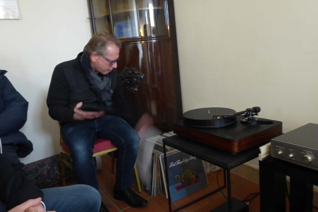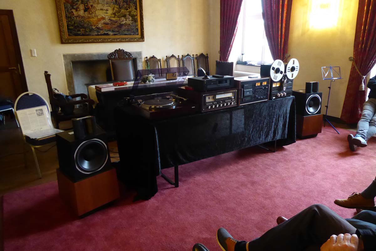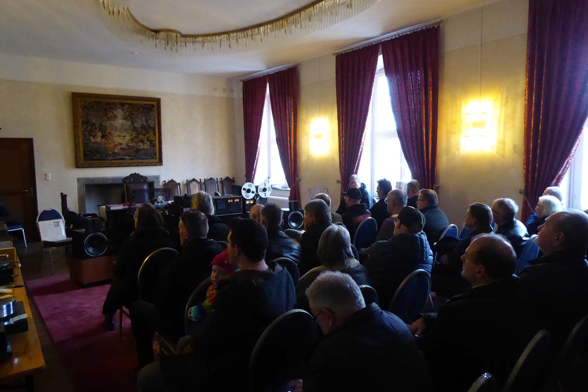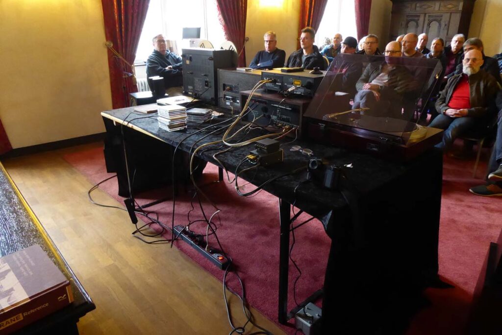 Die Vorträge über verschiedene Musikgenres, die auf dieser Vintage-Anlage musikalisch unterfüttert wurden, erfreuten sich größter Beliebtheit. Das hatte zur Folge, dass sich lange Warteschlangen bildeten, gefördert durch die aus bautechnischen Gründen strikt auf 40 Personen begrenzte Kapazität des “Trauzimmers“. Was wiederum meiner Ansicht nach die zum Saal führende Treppe an ihre statische Belastungsgrenze brachte.