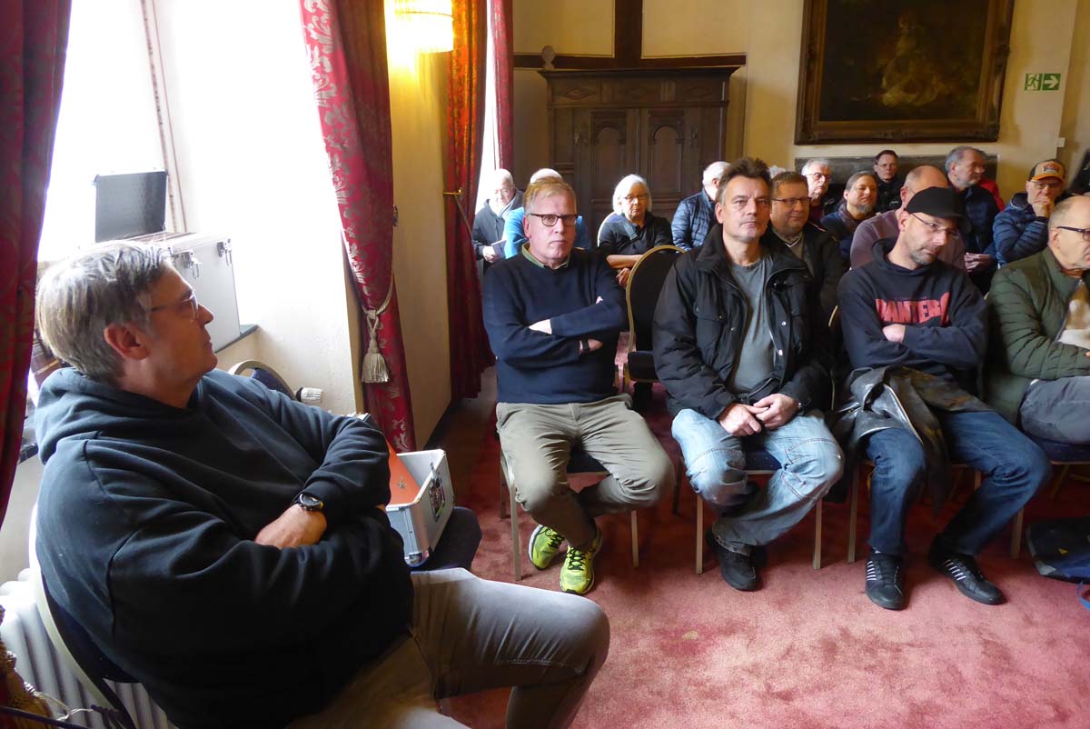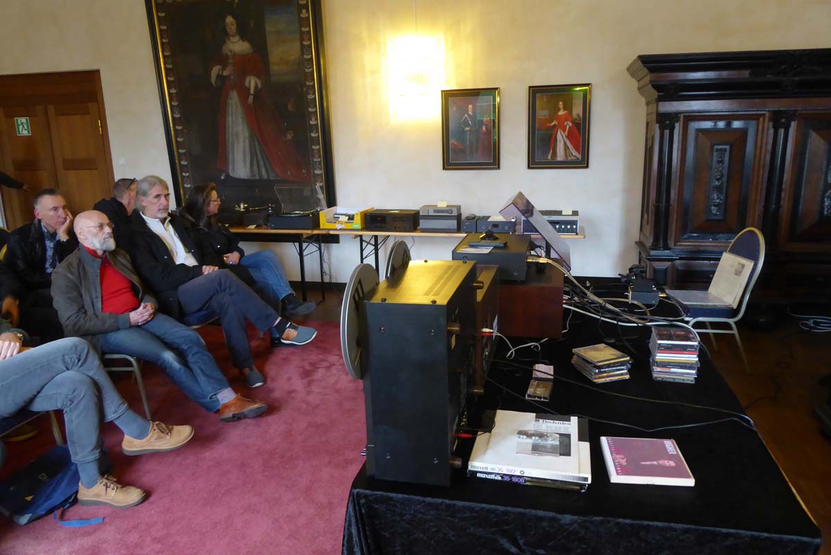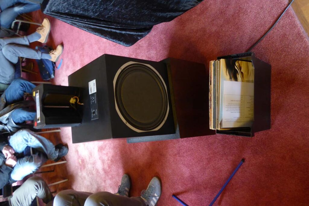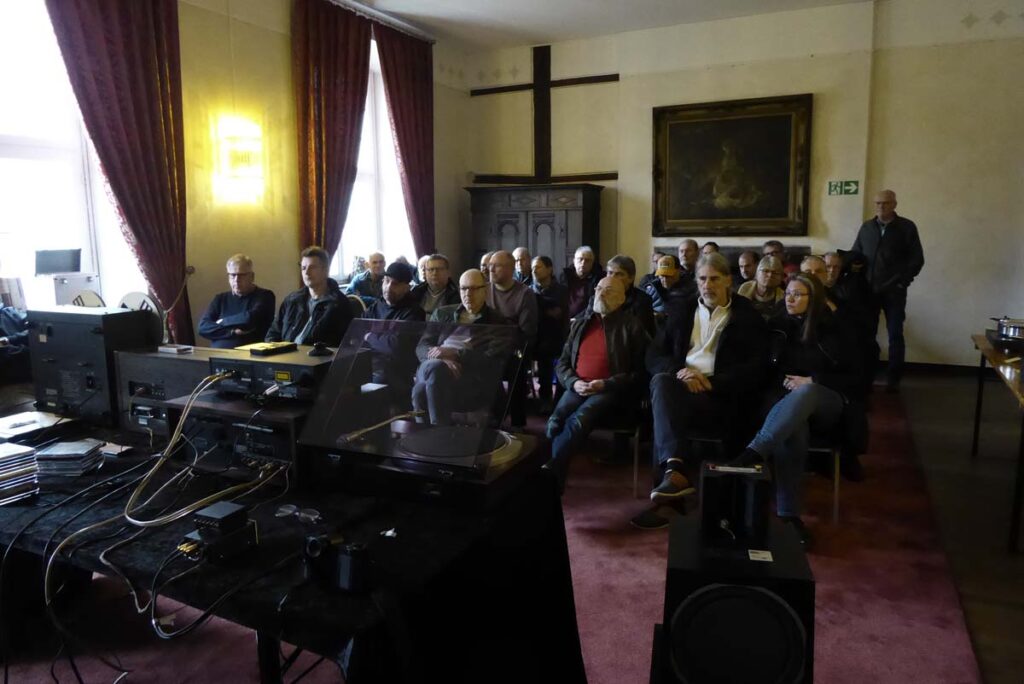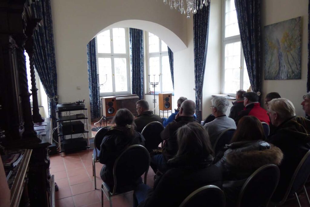 Die Vorträge über verschiedene Musikgenres, die auf dieser Vintage-Anlage musikalisch unterfüttert wurden, erfreuten sich größter Beliebtheit. Das hatte zur Folge, dass sich lange Warteschlangen bildeten, gefördert durch die aus bautechnischen Gründen strikt auf 40 Personen begrenzte Kapazität des “Trauzimmers“. Was wiederum meiner Ansicht nach die zum Saal führende Treppe an ihre statische Belastungsgrenze brachte.
