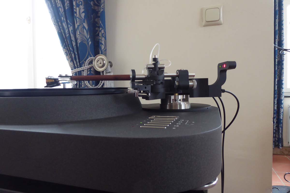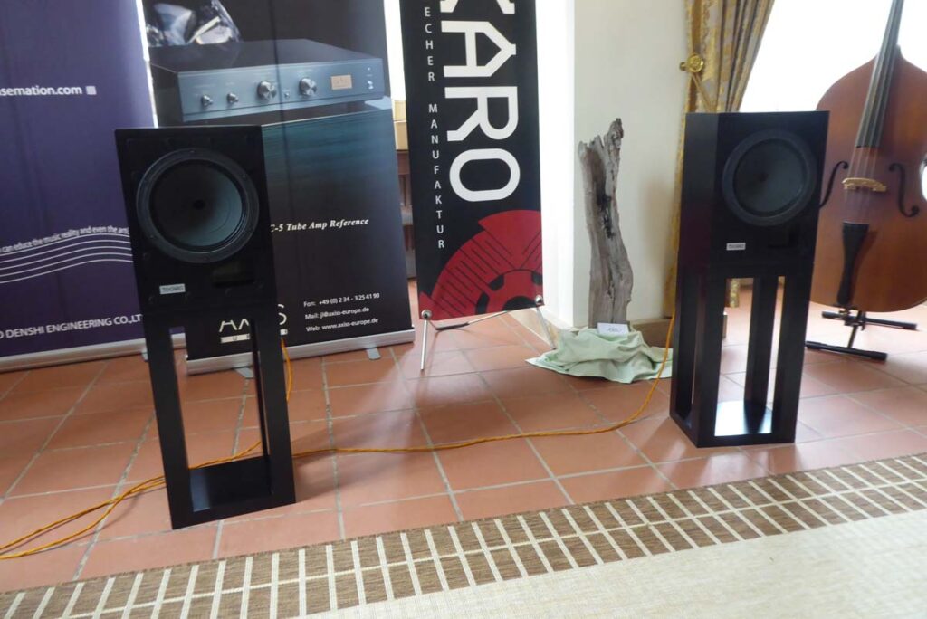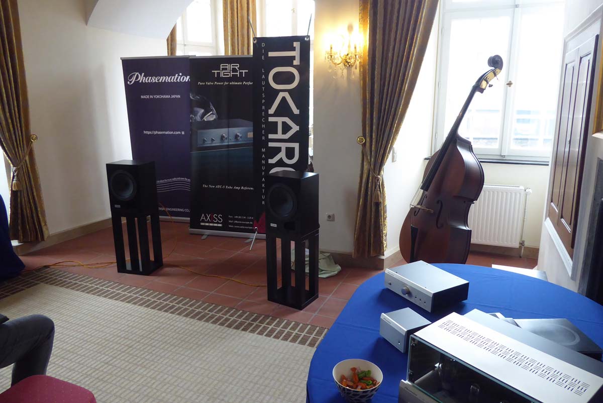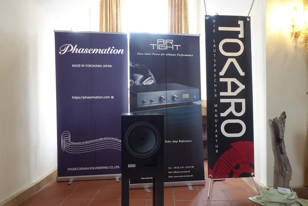 Im Südflügel hatte Jörg Labza vom Axiss Europe-Vertrieb eine feine Anlage zusammengestellt. Quelle war ein Phasemation PP 500 Tonabnehmer am besten Sorane-Tonarm, der wiederum auf einem Laufwerk von Dr. Feickert montiert war. Die Verstärkung der Signale übernahmen Komponenten von Phasemation- und Air Tight. Als Schallwandler kamen wie im Vorjahr Breitbandlautsprecher von Tocaro in einer verbesserten und kompakteren Version zum Einsatz.