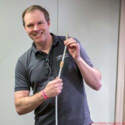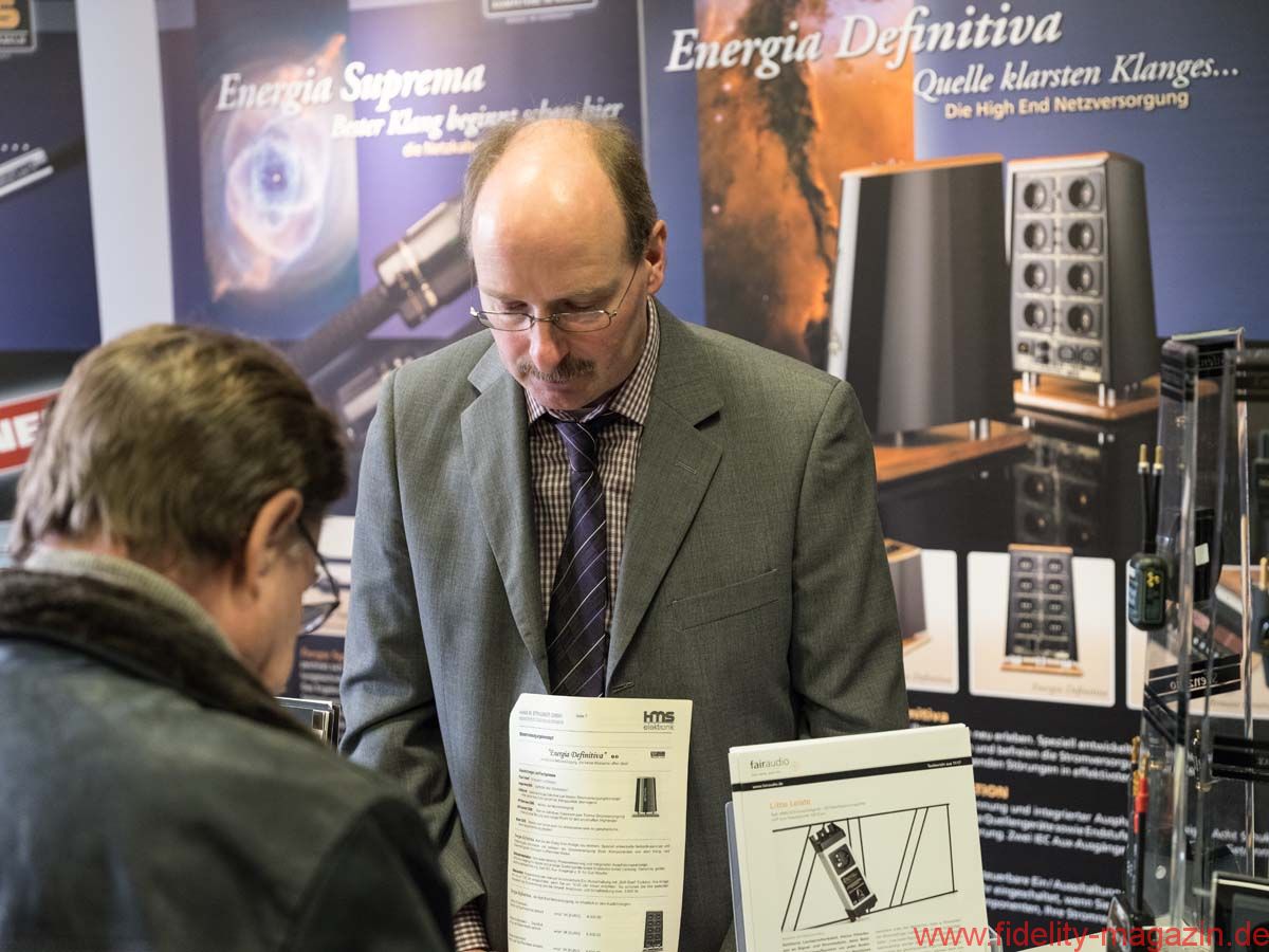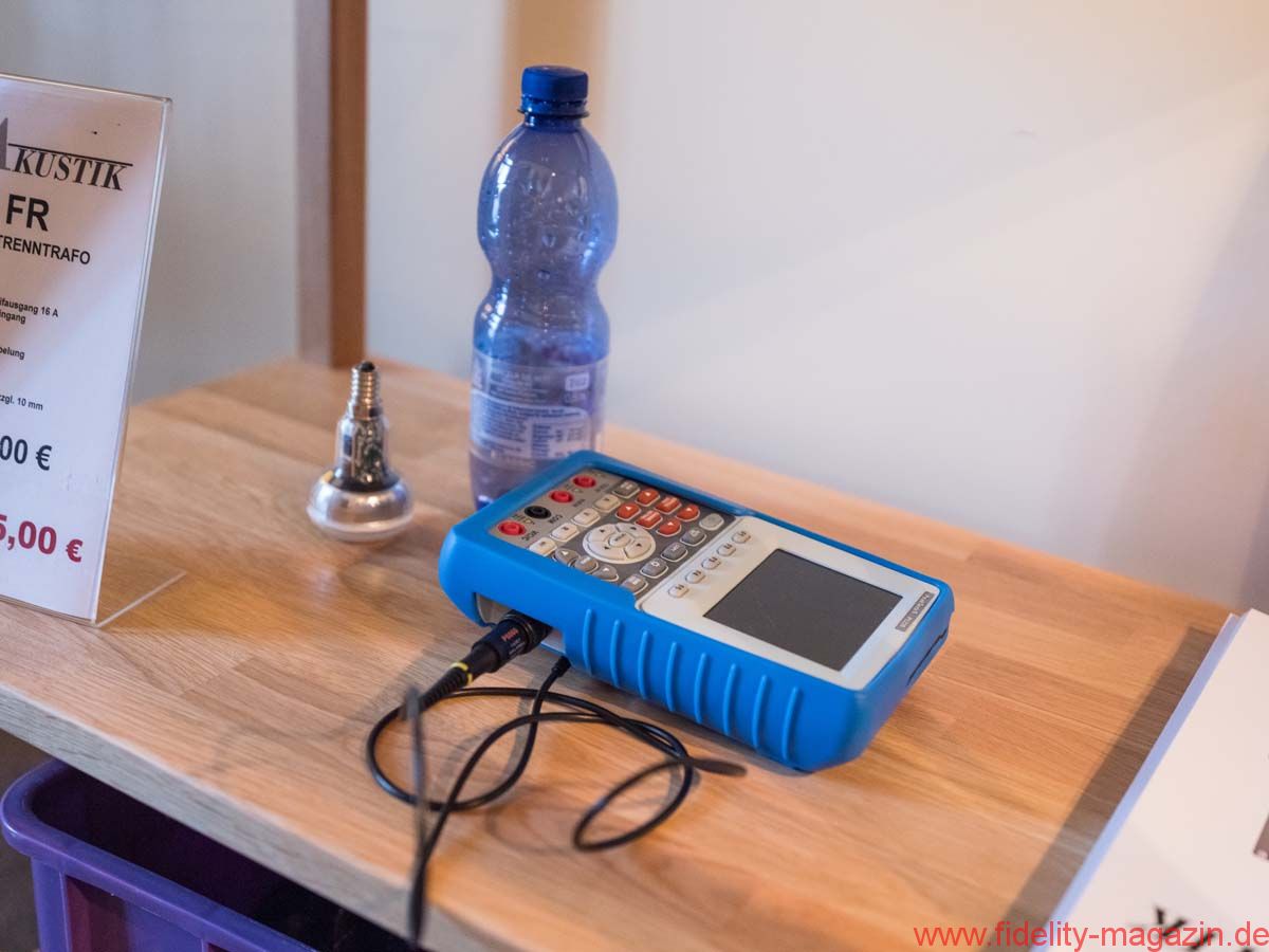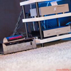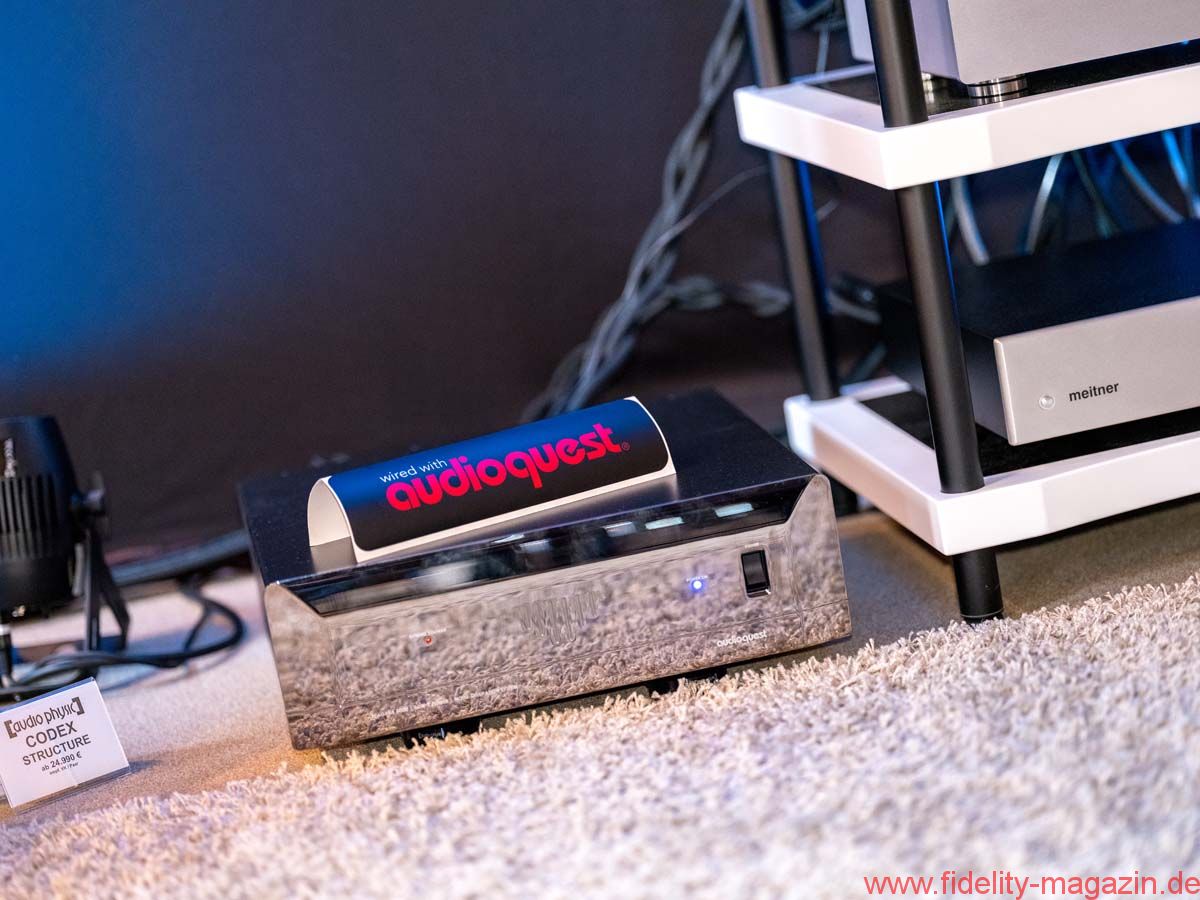 Dieselbe Begeisterung konnte ich gleich ein paar Räume weiter noch einmal einfangen, diesmal bei Christoph Poschadel von X-Odos und Manfred Diestertich von Audio Physic, die sich einig waren, dass „Tuning im Digitalsektor“ ebenso wichtig sei wie bei Analogkomponenten. Auch hier war, wie bei ELAC und einigen anderen, ein großer Netzflter vom Typ AudioQuest Niagara 7000 im Einsatz. Leider lief hier die discomäßige Lichtorgel vom Vorabend (Aufbautag mit Probelauf!) nurmehr auf „audiophilem“ Dauerlicht. Und die leckeren Erdbeerschlangen waren auch schon alle wegschnabuliert! Gut, dass am FIDELITY-Stand noch reichlich Gummibärchenvorräte verfügbar waren.