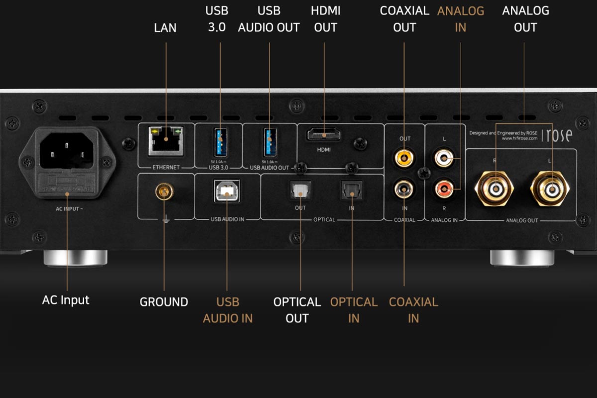 Ausgänge: 2 x analog RCA, 2 x digital SPDIF, TOSLINK, 1 x Kopfhörer, 1 x USB Audio für externen USB DAC
