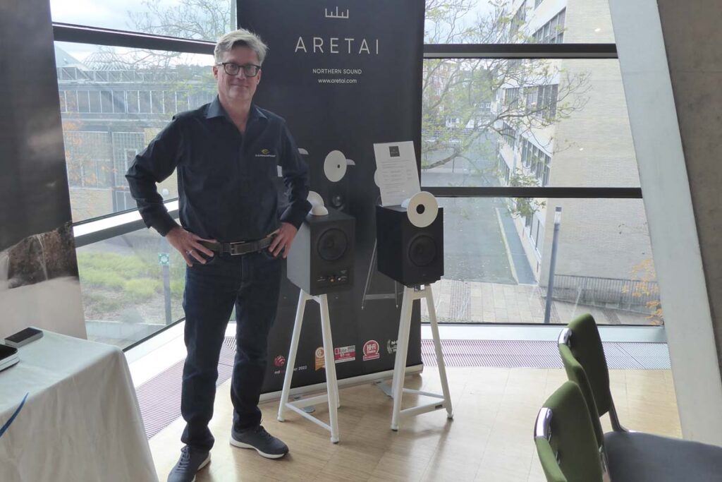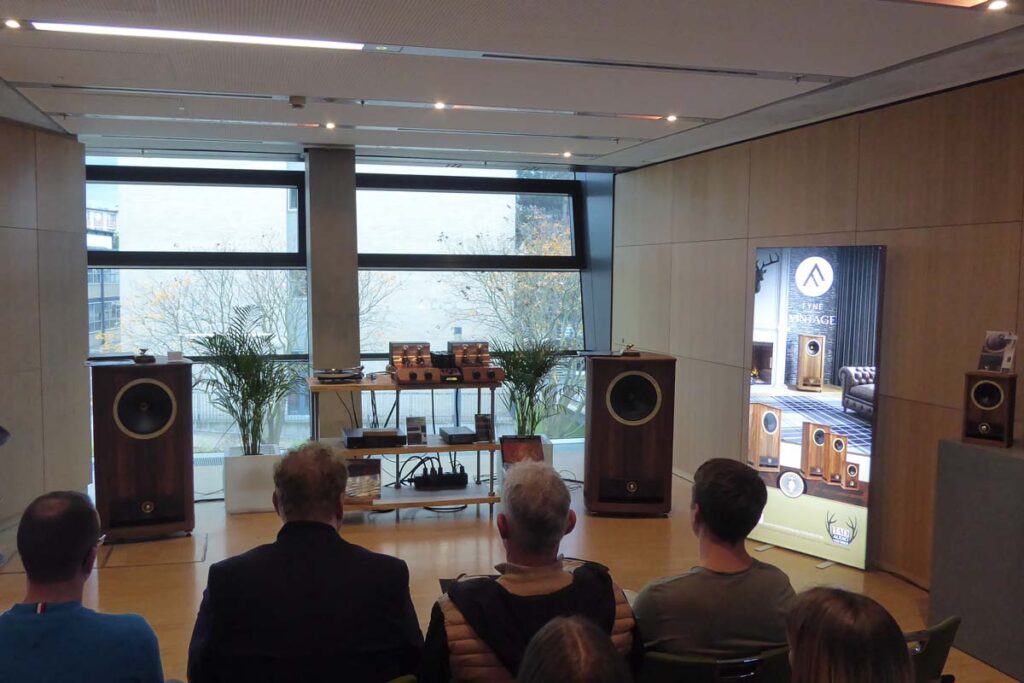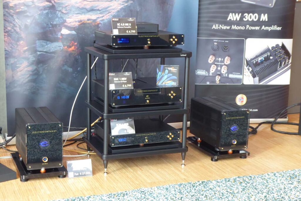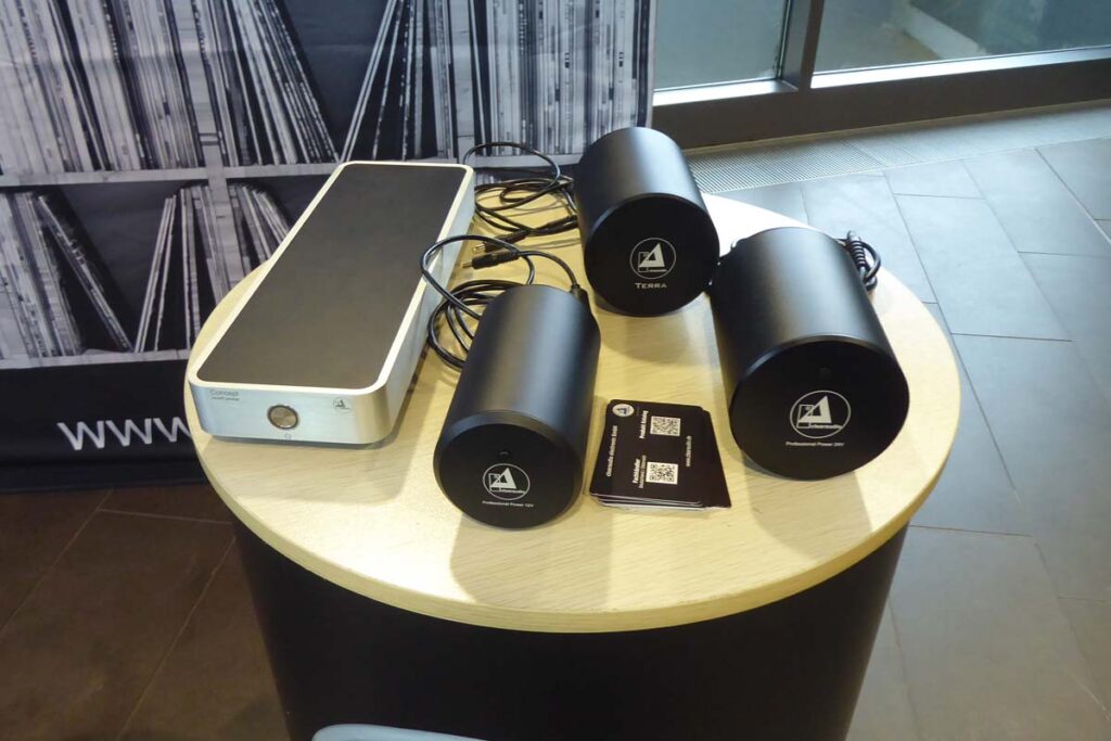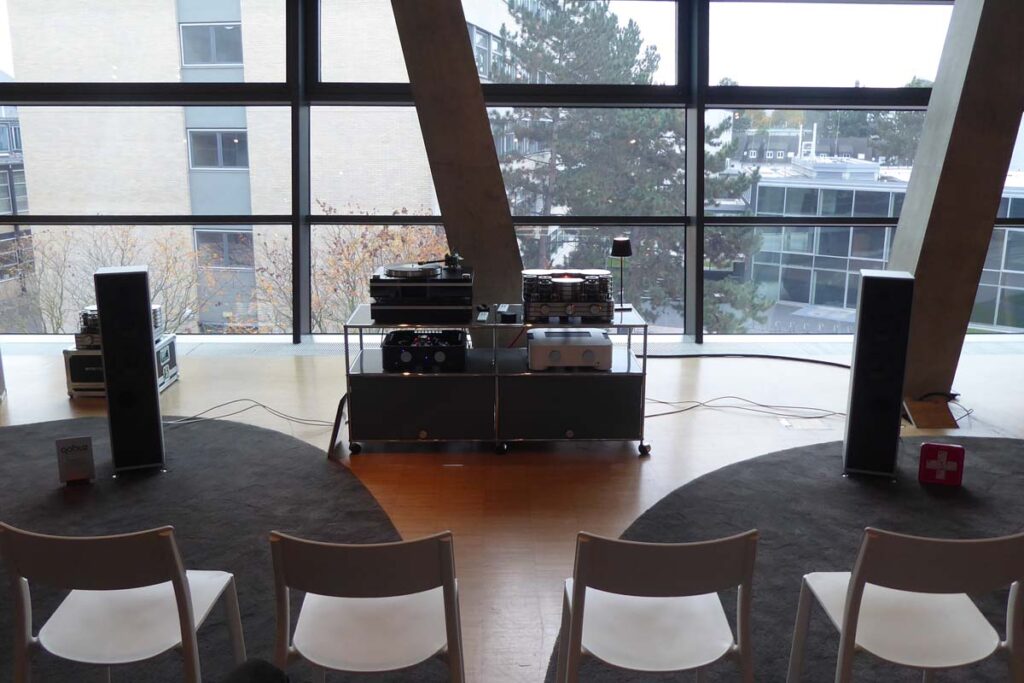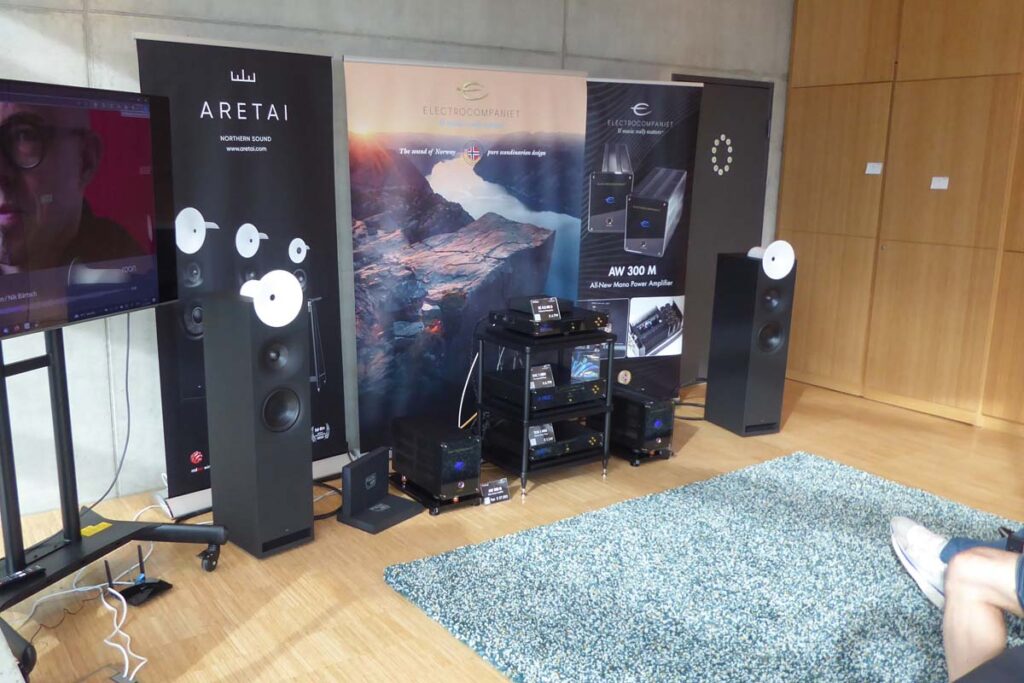 Ich ließ meinen Blick durch die komplexe Struktur des Gebäudes schweifen und fasste den Plan, mich von der obersten Ebene nach unten zu schrauben, was mich direkt zu MRV ins „Hydrogenium“ führte. Matthias Roth bespielte die neu in sein Portfolio aufgenommene Aretai Contra 200F mit bewährter Electrocompaniet-Elektronik inklusive der neuen AW-300M-Monoblöcke. Machtvoll und trotzdem fein klang es, so mein Eindruck.