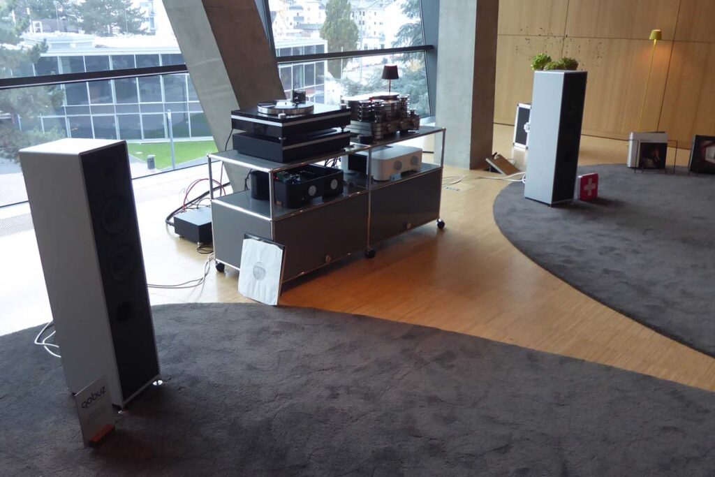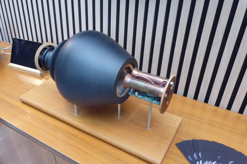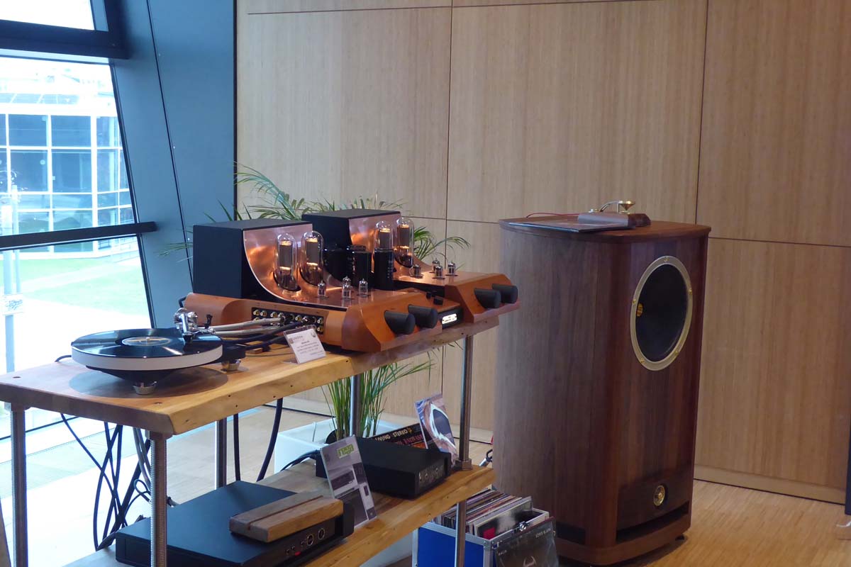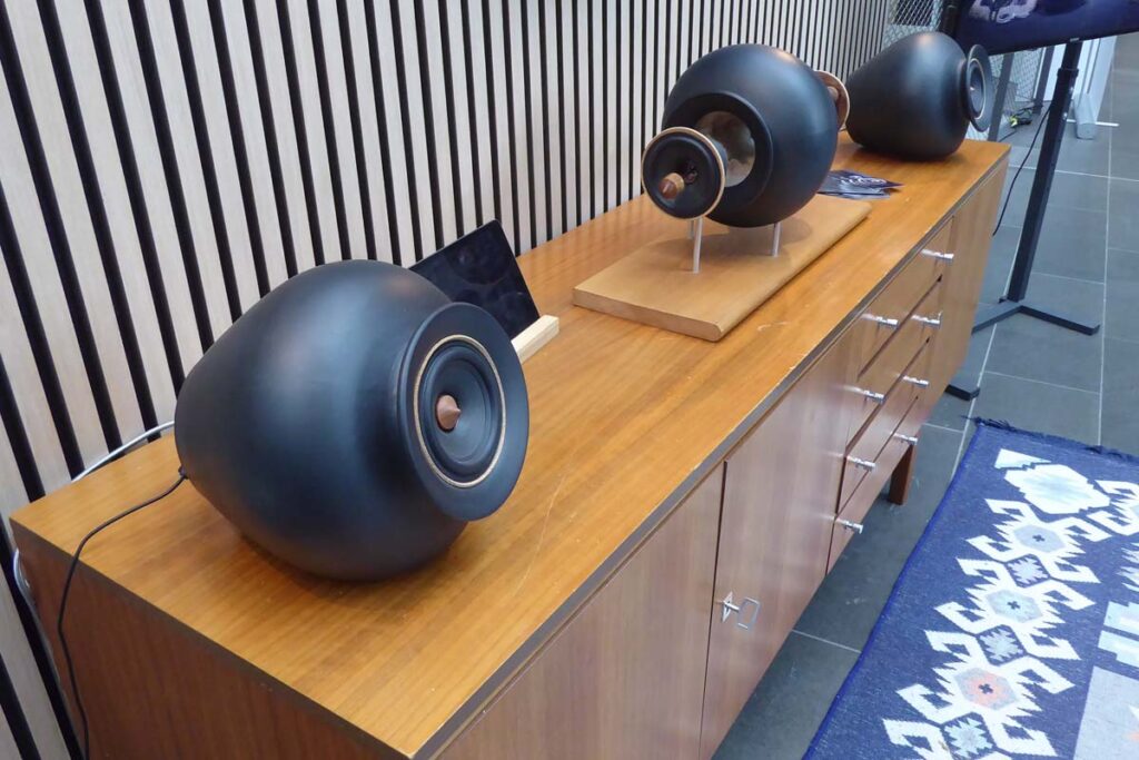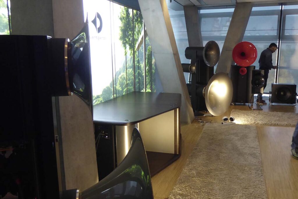 In der Erdgeschossebene sind spektakuläre Lautsprecher ausgestellt, u. a. die scheinbar einer Unterwasserwelt entsprungene Nautilus und eine gewaltige Magnepan 307. Neben Bekanntem entdeckte ich auch Hersteller mit überraschend neuen Ansätzen wie z. B. Mapu mit aktiven Breitbandlautsprechern in getöpferten Keramikgehäusen oder die belgischen Ilumnia mit innovativen sickenlosen Treibern.