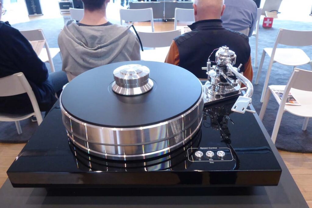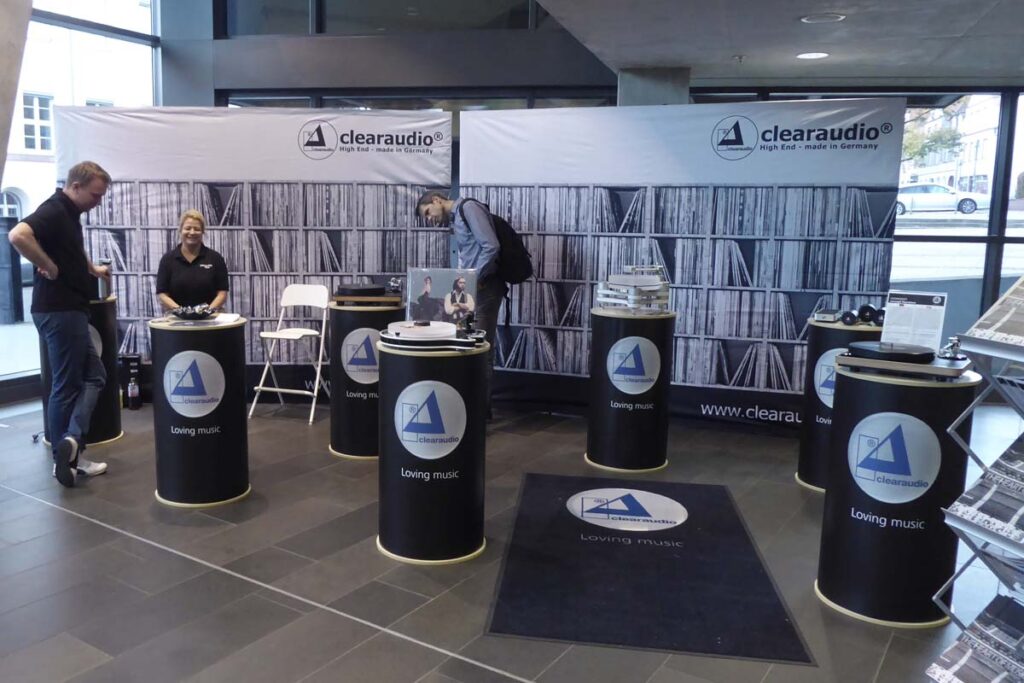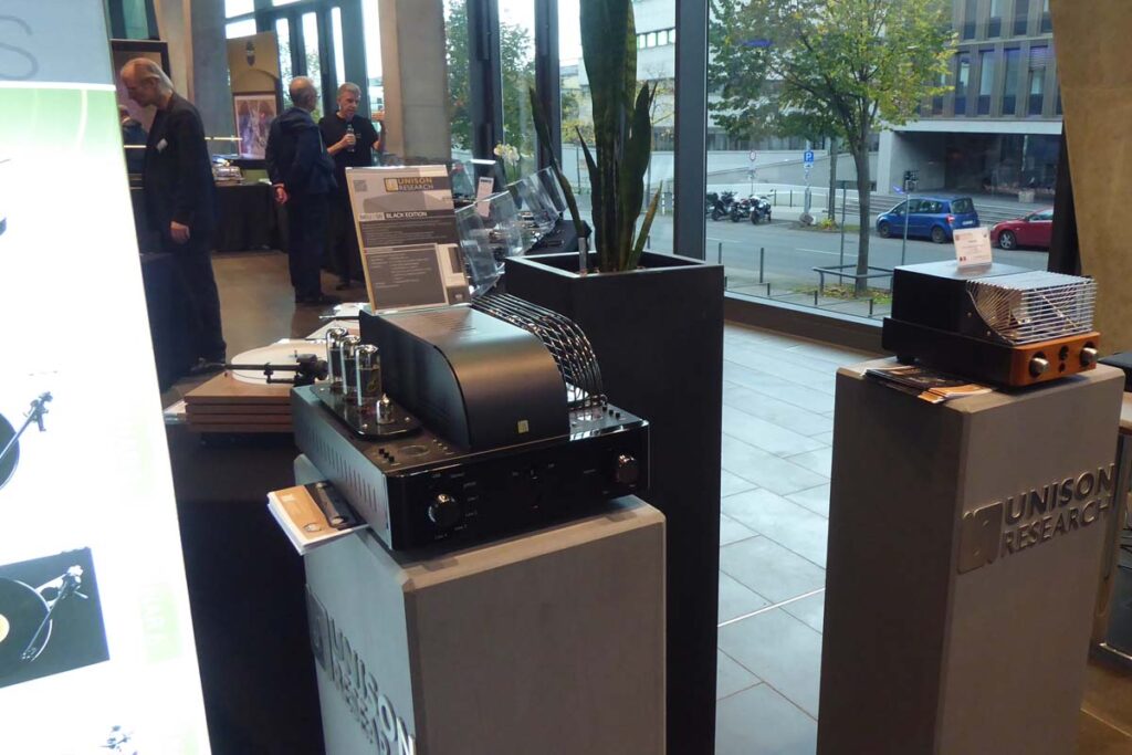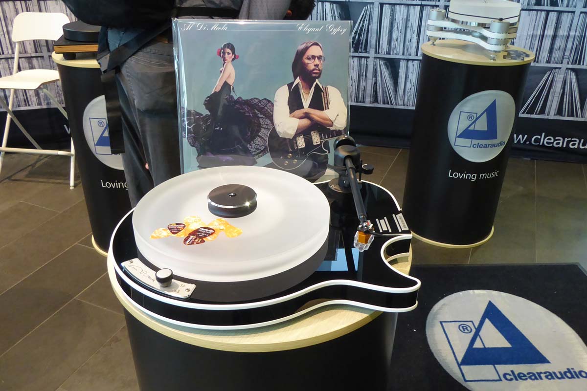 Am Sonntag durchstöberte ich den Ostflügel des Darmstadtiums, wo mehrere Vertriebe/Hersteller ihr Sortiment ausstellten oder zum Kauf feilboten. Neben der exzellenten Vinyl-Auswahl von Sieveking Sound erregte besonders das neue Black-Edition-Modell des von TAD vertriebenen Unison-Research-Röhrenverstärkers meine Aufmerksamkeit, aber auch Clearaudios High-End-Sonderedition „Celebrity Al Di Meola“. Das Chassis dieses auf 1000 Stück limitierten Plug-&-Play-Vinyldrehers hat die Form einer E-Gitarre und ist in schickem Hochglanzschwarz oder nicht minder edlem Palisanderfurnier erhältlich.