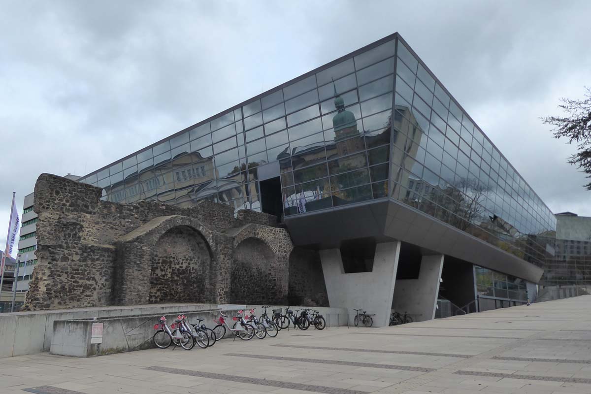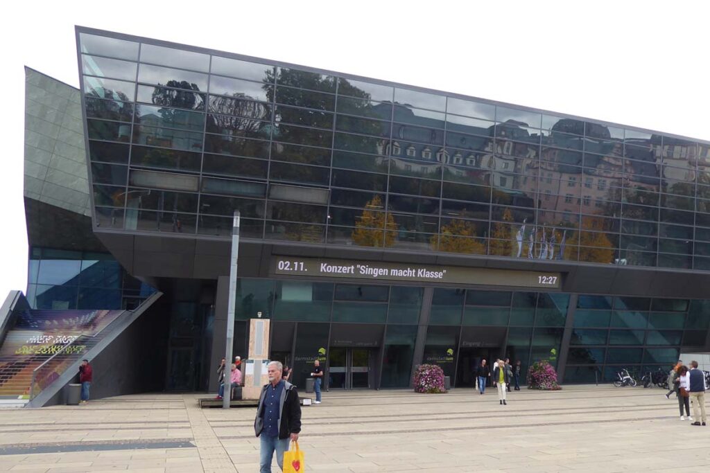 Gegen Mittag erreichten wir den locus rei, das Kongresszentrum Darmstadtium im Herzen der Stadt. Das von Talik Chalabi 2007 entworfene Gebäude mit seinen schräg und zackig zulaufenden Glas- und Natursteinfassaden erinnert an einen gigantischen Steinkristall. Sämtliche Räume sind nach Elementen benannt, und auch der Name des Kongresszentrums, „Darmstadtium“, ist kein bloßes Wortspiel: Namensgeber ist das von Darmstädter Wissenschaftlern entdeckte Element Ds mit der Ordnungszahl 110.