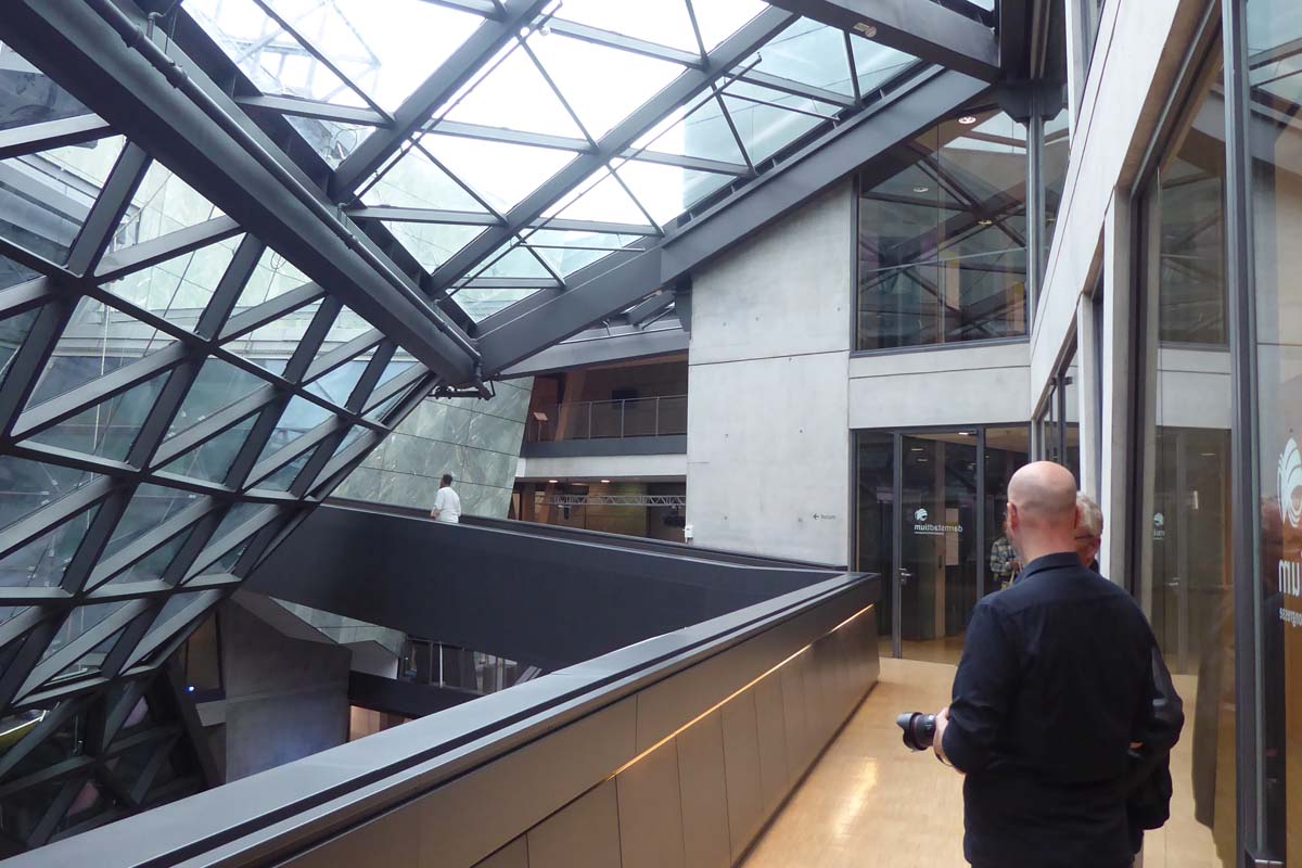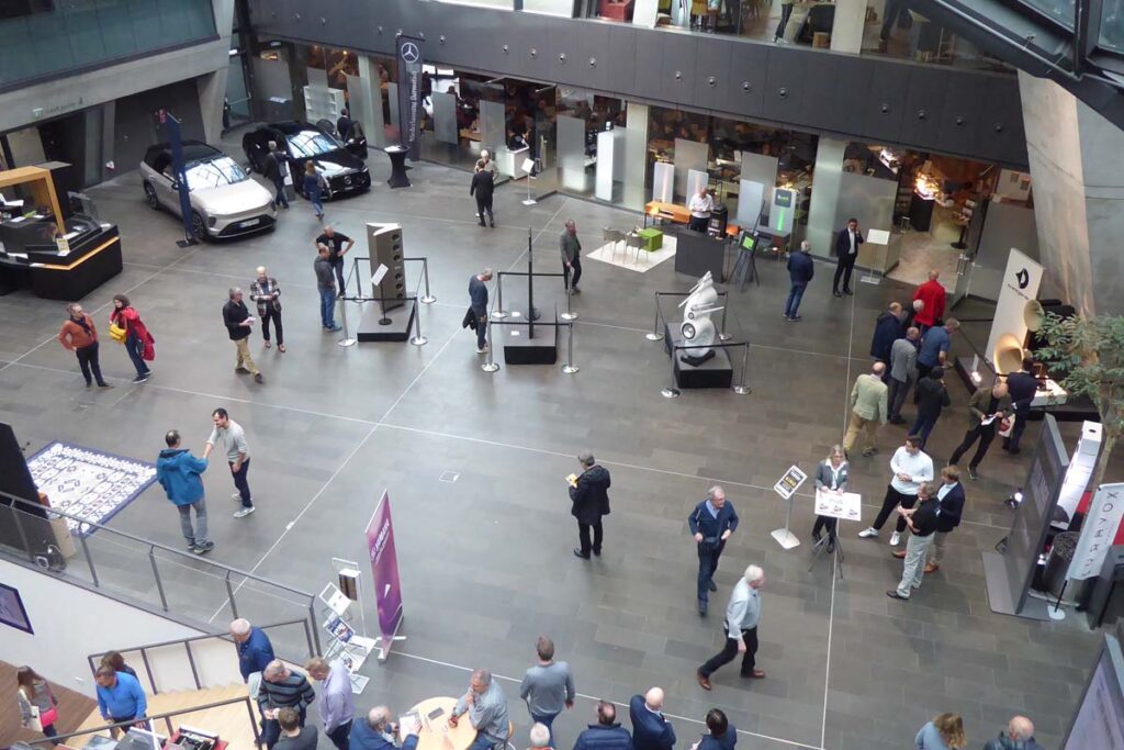 Die während der Bauarbeiten entdeckten historischen Mauerreste wurden geschickt in das Entwurfskonzept integriert und bilden nun einen spannenden Kontrast. Schon allein wegen der architektonischen Leistung ist dieses Gebäude einen Besuch wert! Die positiven Eindrücke setzen sich fort, als wir das vom Tageslicht durchflutete Atrium betreten – das Klima hier ist wirklich angenehm, und die Messeatmosphäre unterscheidet sich spürbar von Hotelveranstaltungen mit den oft engen, stickigen Gängen und akustisch fragwürdigen Hotelzimmern.