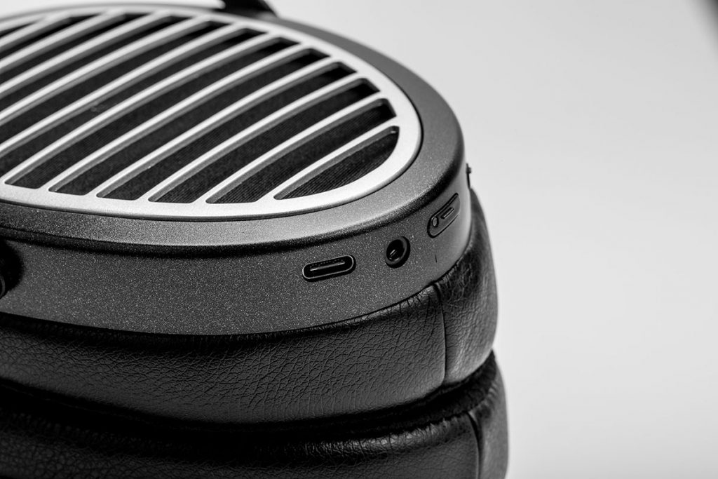 Lediglich die Unterseite der rechten Ohrmuschel unterscheidet den Wireless-Kopfhörer vom kabelgebundenen Pendant. Hier sitzt neben einem USB-C-Port eine 3,5-Millimeter-Klinkenbuchse für das Mikrofon und der On/Off-Switch, der auch für das Bluetooth-Pairing und die Gesprächsannahme verwendet wird. Der Knopf hinter dem Power-Button wird zum Aufladen verwendet.