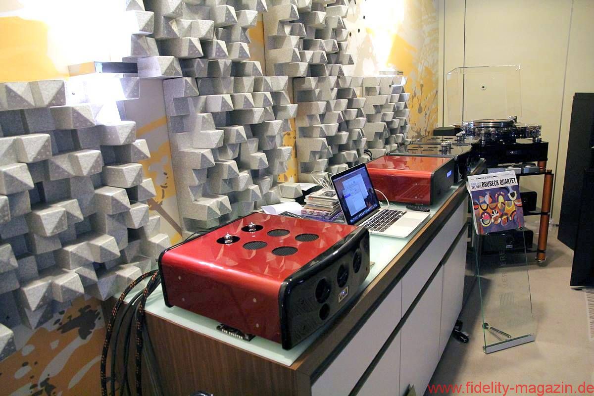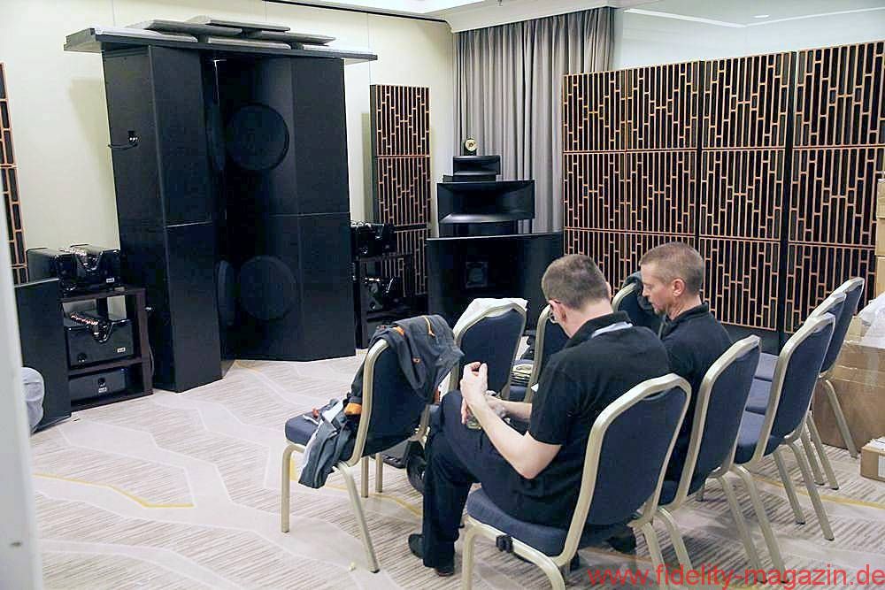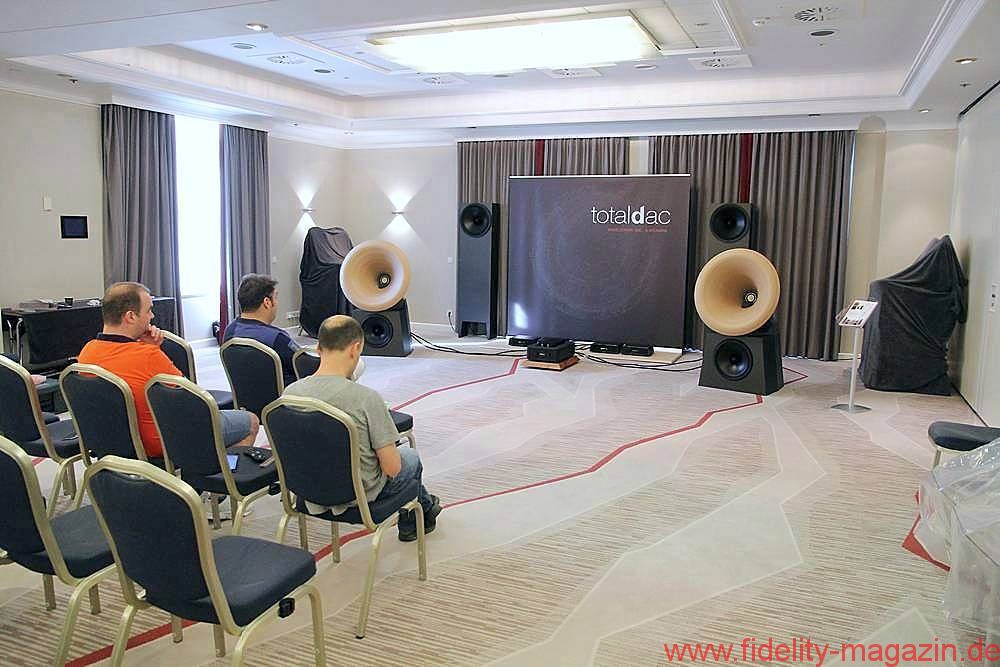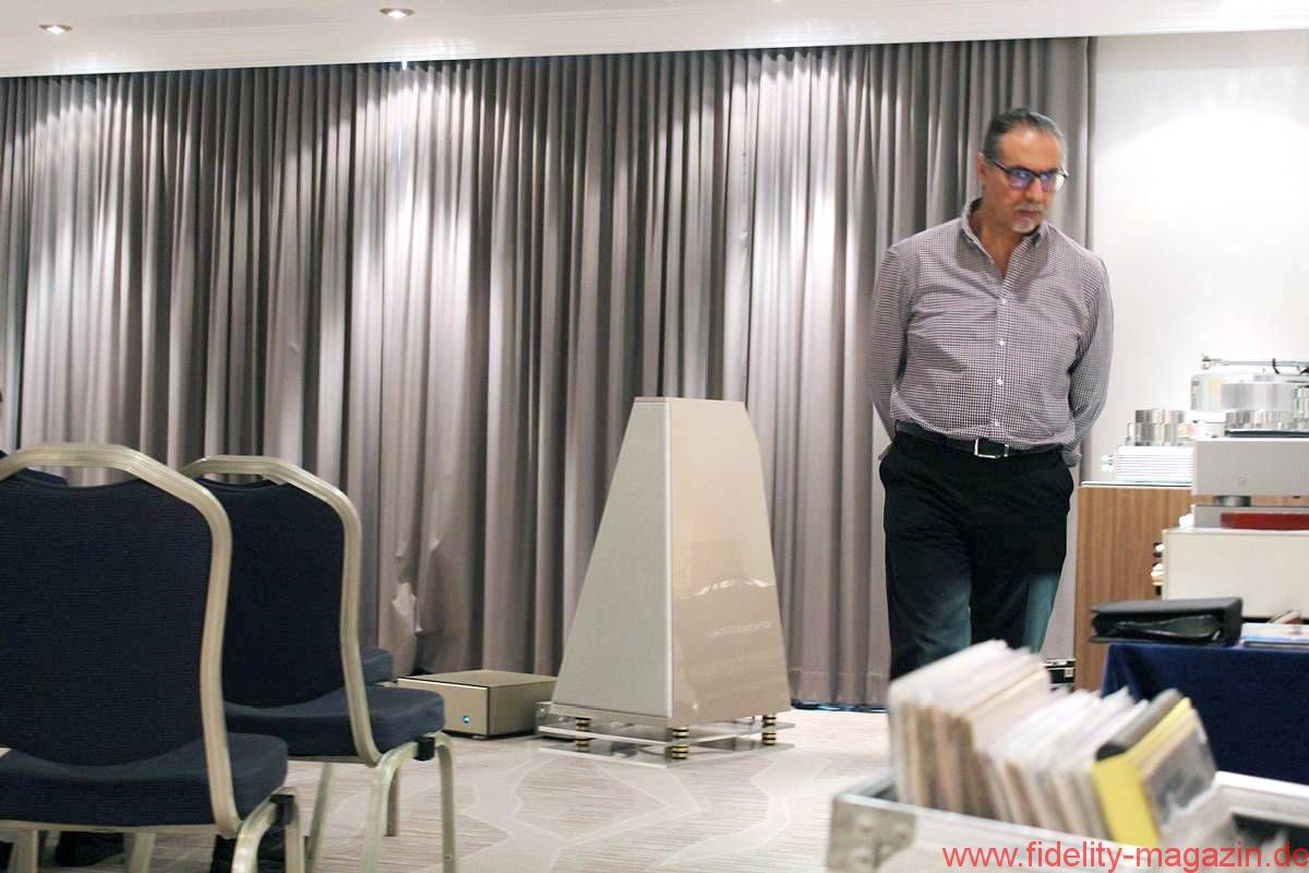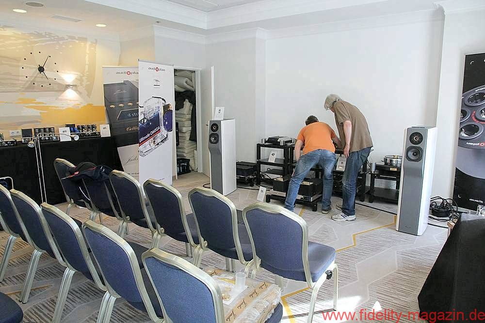 Bei der parallel stattfindenden hifideluxe im Hotel Marriott kommt der Klang-Kulinariker in mir zu seinem Recht. Davon abgesehen, dass durch das angenehm hektikfreie Hotelambiente eine ganz andere Atmosphäre als im summenden Messe-Bienenstock MOC herrscht, wirken auch die Hörräume besser präpariert, obwohl sie deutlich kleiner sind. Zunächst bleibe ich bei QUAD hängen, wo man den Beweis antritt, dass auch in der kleinsten Hütte noch Platz für einen großen Flächenstrahler ist, wenn man ihn nur richtig aufstellt und einpegelt.