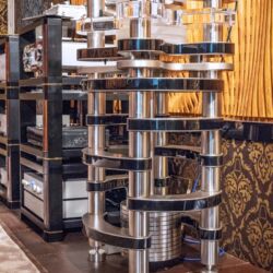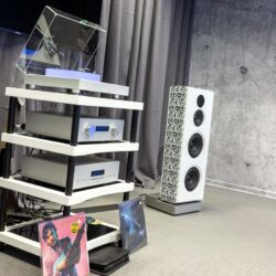 Und nun das! Gleich zwei neue Plattenspieler stellte AVM-Chef Udo Besser in München vor. Der Evolution R 5.3 und der Inspiration R 2.3 treten in unterschiedlichen Preisklassen an, haben aber beispielsweise den zuverlässigen und vor allem gleichlaufstabilen „elipsozentrischen“ Riemenantrieb (zur Minimierung des Kippmoments) und auch die aparte blaue Beleuchtung des Acryltellers gemeinsam. Den im AVM-Portfolio weiter oben angesiedelten Evolution statten die Malscher mit einem selbst entwickelten und gebauten Zehnzoll-Tonarm aus, ein Neunzöller werkelt im Inspiration. Die Zarge der klassisch designten Dreher ist aus Composite-Material, etwas aufwendiger beim Evolution, etwas einfacher beim Inspiration, immer verstärkt durch gebürstete Aluminiumteile, wobei der „Kleine“ auch in schlichtem Schwarz zu wirken versteht. Um die Entwicklung zum Vollsortimenter komplett zu machen, kommt von AVM auch bald der erste Lautsprecher. Wie der AM 6.3 Active Monitor klingen wird, kann ich angesichts fehlender Vorführexemplare – auf der High End waren nur folierte Gehäusedummys ohne Innenleben zu sehen – noch nicht sagen, angesichts der sonstigen AVM-Expertise wird aber auch dieser kleine Standlautsprecher wohl etwas Besonderes werden.