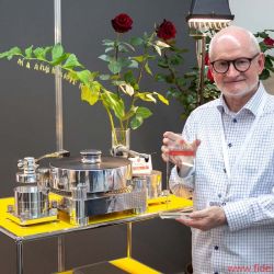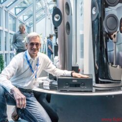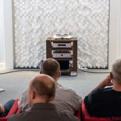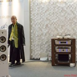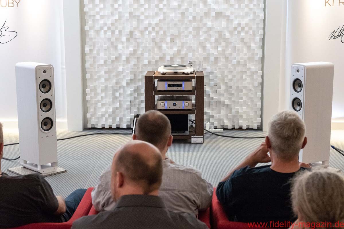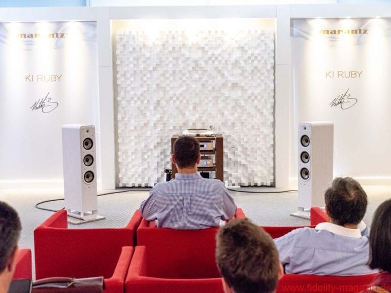Der sympathische Japaner ist ein dezidierter Showman, der nicht nur extrem extravagante Outfits trägt, sondern sein eigenes 40-jähriges Firmenjubiläum mit einer Verstärker-CD-Player-Kombination feiert, die er schlicht „KI Ruby“ getauft hat. Geräte, die klanglich so nah an der Flaggschiff-10er-Linie rangieren, dass es für die Firmenumsätze wohl von positivem Effekt ist, wenn sie nur als limitierte Edition angeboten werden. Im letzten Jahr wurde die Denon-Marantz-Group ja wie berichtet von der Sound United LLC (Muttergesellschaft der Marken Polk Audio, Definitive Technology und Polk BOOM) übernommen. Die Polk-Boxen, mit denen Ken Ishiwata seine Rubys vorführte, wussten mich allerdings (noch) nicht zu überzeugen. Dafür stimmte die Musikauswahl – wahrscheinlich, weil Ishiwata-san selbst Musiker ist und essenzielle Dinge erfahrungsgemäß nicht dem Marketing überlässt. So entsprach er etwa sofort der Bitte, die feine Ruby-Kombi auch mit analoger Quelle hören zu dürfen und spielte feinen Bigband-Jazz von Schallplatte, was auf Anhieb überzeugend wirkte und für die im Verstärker integrierte Phonostufe spricht. Die beiden Rubys stehen übrigens auch für einen (leicht zu übersehenden) Trend zu tatsächlich bezahlbaren High-End-Komponenten, die klanglich deutlich näher als noch vor ein paar Jahren an den Topline-Produkten orientiert sind und damit den Einstieg in der Welt schönstes Hobby erleichtern. Angesichts dessen, dass auf der Messe an den Besuchertagen wieder mehr junges Publikum unterwegs war, ein wichtiger Schritt zur Sicherung einer klangvollen Zukunft. Dass Preziosen wie die Rubys auch das Verlangen nach Geräten befriedigen, die nicht jeder daheim stehen hat, ist ein angenehmer Nebeneffekt. Chefentwickler Rainer Finck deutete übrigens an, dass die Rubys ab Herbst lieferbar sein werden – und dass man als Interessent schnell sein muss, weil sie in Deutschland genauso wie weltweit wohl nur in sehr geringer Stückzahl angeboten werden.