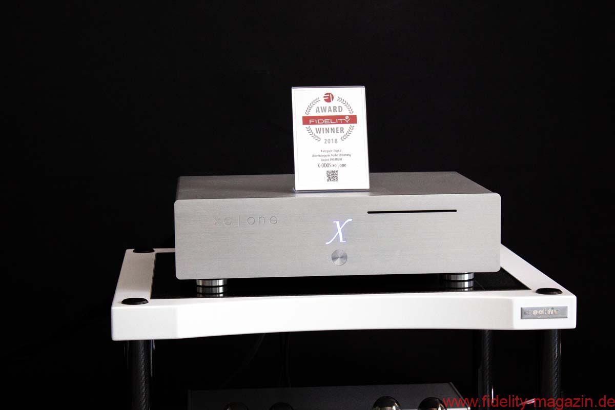 Als Aussteller teilte sich x-odos einen Raum mit Audio Physic, ward aber auch an anderen Stellen gesehen, so führte beispielsweise Audioquest seine Niagara-Netzfilter mit dem xo|one als Frontend vor. Im Gegenzug fand sich auch ein Audioquest Niagara 7000 bei x-odos, die Verstärkung kam vom deutschen Röhrenspezialisten Octave. Natürlich sind Lautsprecher spektakulärer als die schlicht gestaltete zweite Version des x-odos-Servers, zumal wenn sie wie die neue Audio Physic Structure komplett in Carbon gekleidet sind. Auch von innen präsentiert sich die neue Schallwandler-Generation aus Brilon Aufsehen erregend mit einem Kammersystem aus porösem, strukturiertem Material, aber bevor ich ins Detail gehe, komme ich lieber wieder zurück zu x-odos, dem eigentlichen Grund meines Besuchs. Gründer und Chef Christof Poschadel hatte einen frisch verliehenen FIDELITY-Award im Gepäck und zeigte sich mächtig stolz darauf.