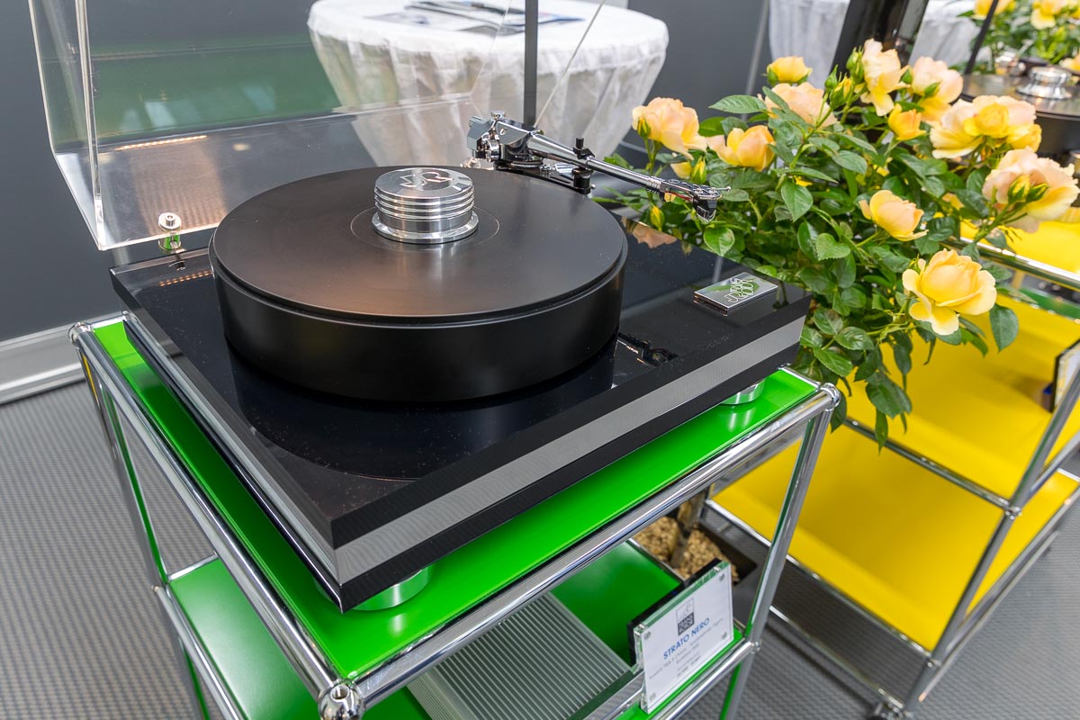Ein paar Meter weiter können der deutsche Plattenspieler-Guru Jochen Räke und sein Team sogar neue beziehungsweise tiefgreifend überarbeitete Laufwerke vorstellen, beispielsweise den Transrotor Max, dessen skulpturales Äußeres in sattem Mattschwarz als „Max Nero“ noch besser zur Geltung kommt. Der Massimo Nero (Test in FIDELITY 62) macht es dem Max nach und kommt schwarz wie die Nacht daher. Den Transrotor Strato Nero gibt es seit neuestem auch in elegantem Schwarz-Weiß-Design. Das riesige Laufwerk mit seinen drei Antrieben wurde von Jochen Räke wie gewohnt bis ins Detail ausgefeilt. Weil es keine eleganten und zuverlässigen Hebelvorrichtungen für die große Acrylhaube gab – richtig gehört: man trägt wieder Haube! – entwickelten die Gladbacher einfach eine eigene Mechanik, die wohl auch dann noch störungs- und knirschfrei hebelt, wenn der Dreher selbst schon lange aufgehört hat zu existieren.