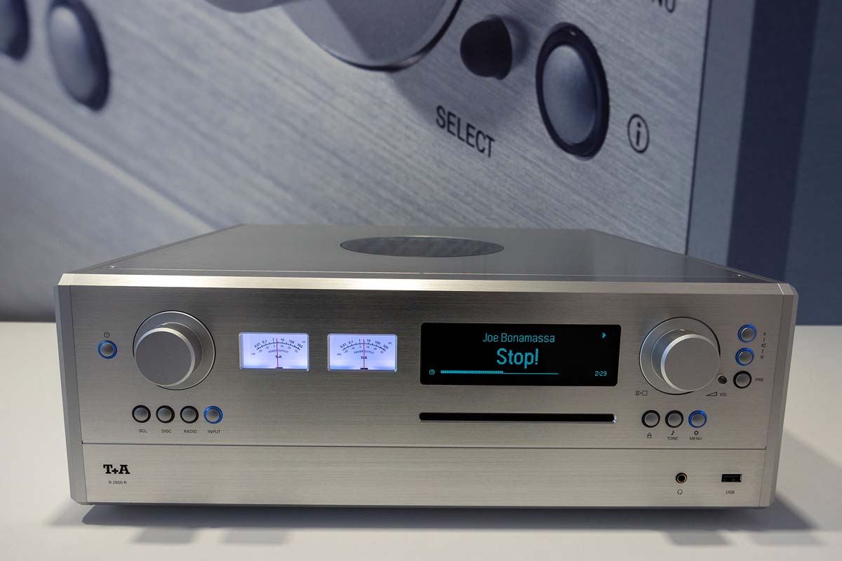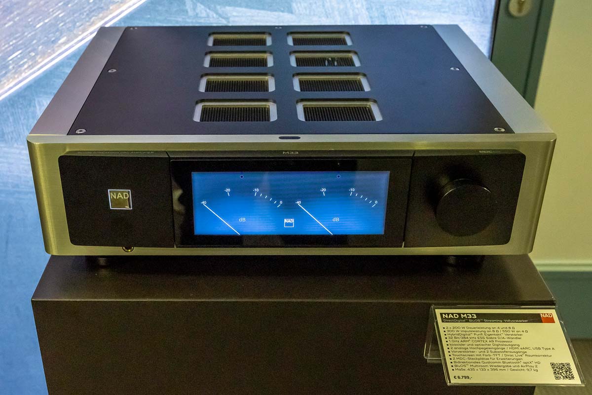 Das Auge isst mit, und so blieb ich eine Weile am Stand von HiFi Rose hängen und spielte mit den vielen Knöpfen, Kippschaltern und vor allem dem zahnradgekoppelten Lautstärkeregler des Vollverstärkers RA180, der auf seiner Phalanx von Ausgangsklemmen bis zu 1100 Watt stemmen kann, einen gesonderten Subwoofer-Ausgang hat und so aussieht, als käme er direkt aus einem Tonstudio der 1960er Jahre. Ein erstaunliches Statement für eine Firma, die ansonsten mit ultramodernen Streamern reüssiert.