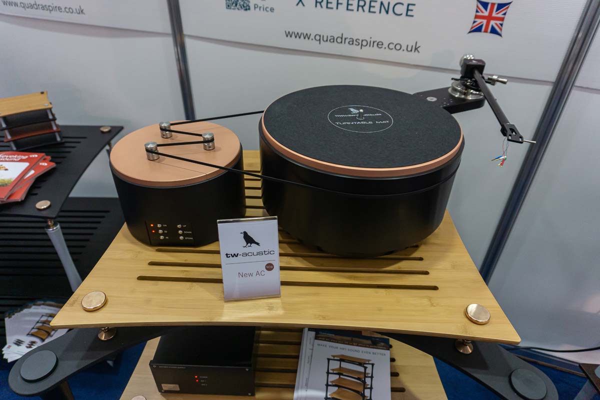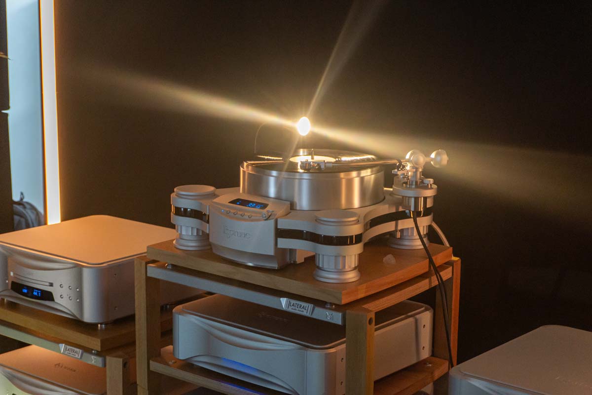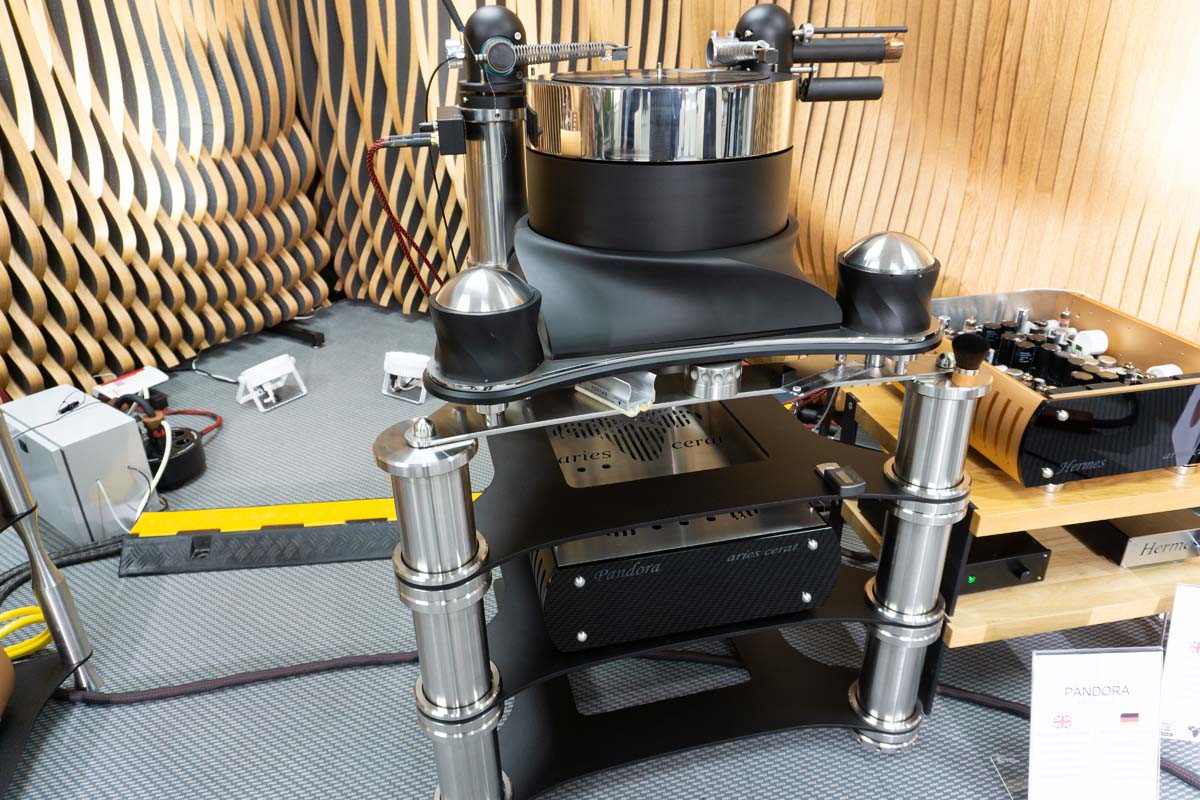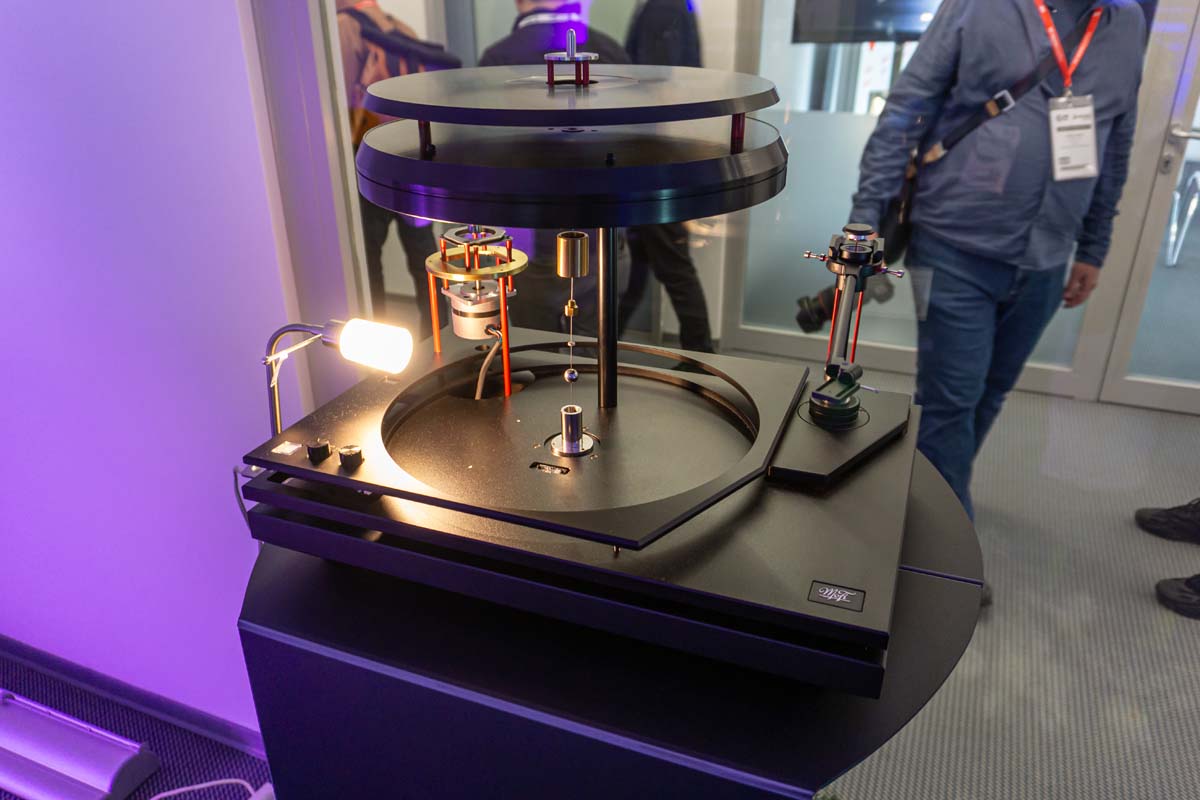 Aries Cerat zeigte einen der kompromisslosesten Plattenspieler der gesamten Messe. Das rund 400 Kilogramm schwere Laufwerk arbeitet mit einem hydrodynamischen Lager und einem Direktantrieb, der mit 2 kW Leistung so massiv ausgelegt ist wie kaum ein anderer. Technisch wie optisch wirkt hier alles wie aus einem Guss – imposant, überdimensioniert und konsequent durchdacht.