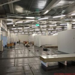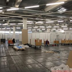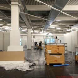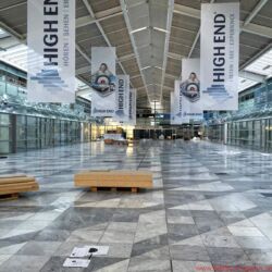 Die ersten sind tatsächlich schon da, aber ansonsten sehen die Hallen im MOC noch nicht nach High End aus. Auch der High End Ballon hängt noch schlaff herunter. Morgen geht’s dann richtig los.