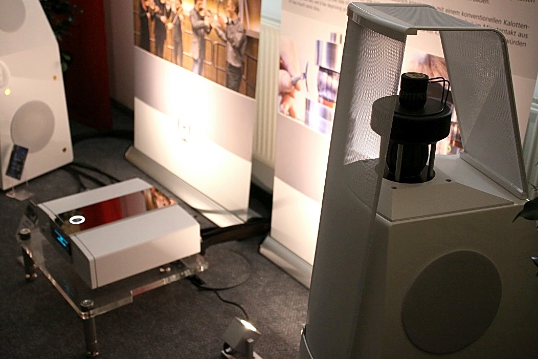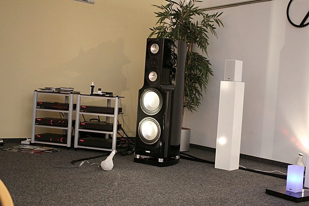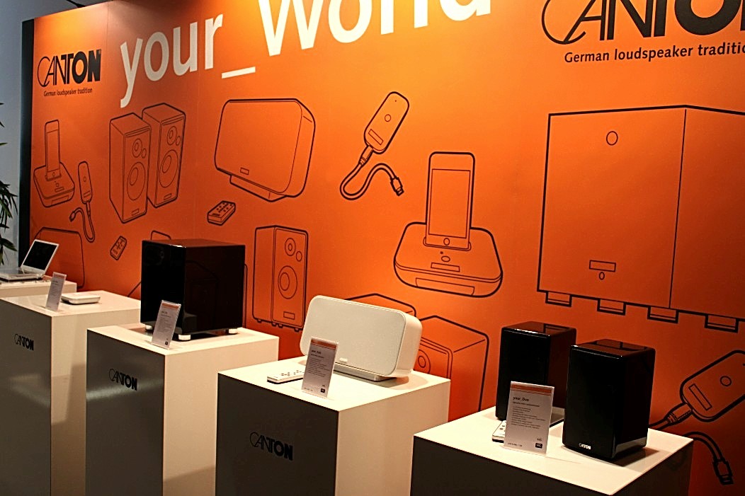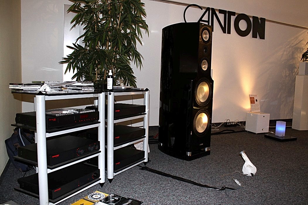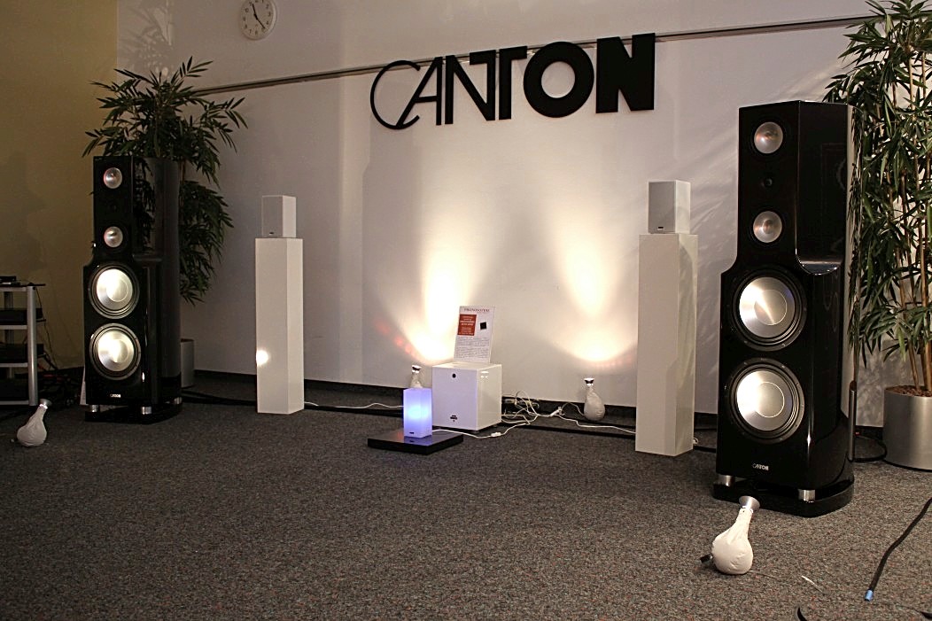 Eine gleichermaßen überzeugende Präsentation, jedoch mit deutlich mehr Dampf, bot Canton. Dort war das große Model der Reference-Serie am Start und zeigte sehr überzeugend die Sinnhaftigkeit von großen Lautsprechern, bei denen das Gehörte im wahrsten Sinne des Wortes körperlich wird. Eine komplette Phonosophie-Kette von Ingo Hansen verlieh den zwei Canton Taunuskindern ordentlich Schub. FIDELITY hat dazu ein kleines Video gedreht, auf dem man die harte Arbeit der Tieftöner beobachten kann. Kontrastprogramm zur Reference-Serie war ein „kleines“ Sub- Sat-System aus der „your_world“ Serie. Aktiv angetriebene Lautsprecher, die per Funk verbunden sind und das Thema Lautsprecher nahezu kabellos machen. Sehr einfach und flexibel in der Handhabung, klein im Preis ( 2 Lautsprecher, 1 Subwoofer, eine Dockingstation, alles aktiv und per Funk verbunden für rund 1000 EUR!) und auffallend erwachsen im Klang. Very well done!