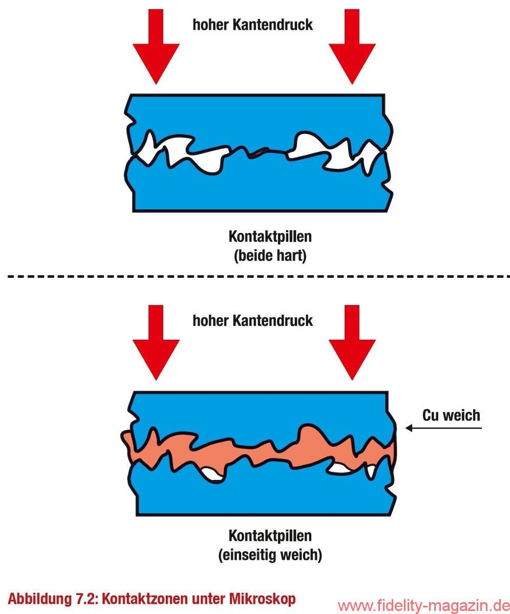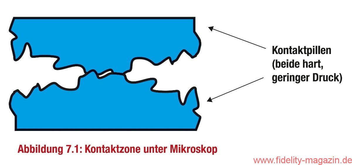 Die Verhältnisse sind noch wesentlich größer, als es die genannten 100 bis 1000 vermuten lassen, da die eigentliche Kontaktzone ja nicht 2 mm hoch ist, sondern nur wenige μm. Das bedeutet, der weitaus überwiegende Teil der Kontaktfläche liefert gar keinen Kontakt und ist mit Luft oder Oxidationsprodukten gefüllt. Was ist also zu tun? Zwei naheliegende Dinge sind da spontan zu nennen. Erstens: Wir erhöhen den Druck der Kontaktstücke aufeinander. Das wird die Spitze verformen und zu größeren Kontaktflächen führen, ist bei großer Härte der Kontaktmaterialien aber nicht sonderlich wirksam. Oder zweitens: Wir nehmen eine der beiden Kontaktpillen mit einer besonders weichen metallischen Beschichtung. Die harten Spitzen des anderen Kontaktes werden die weiche Beschichtung fließend verformen, sodass auch die Täler zwischen den Kontakten mit leitendem Metall aufgefüllt werden und an der Leitfähigkeit des Kontaktes teilhaben.
