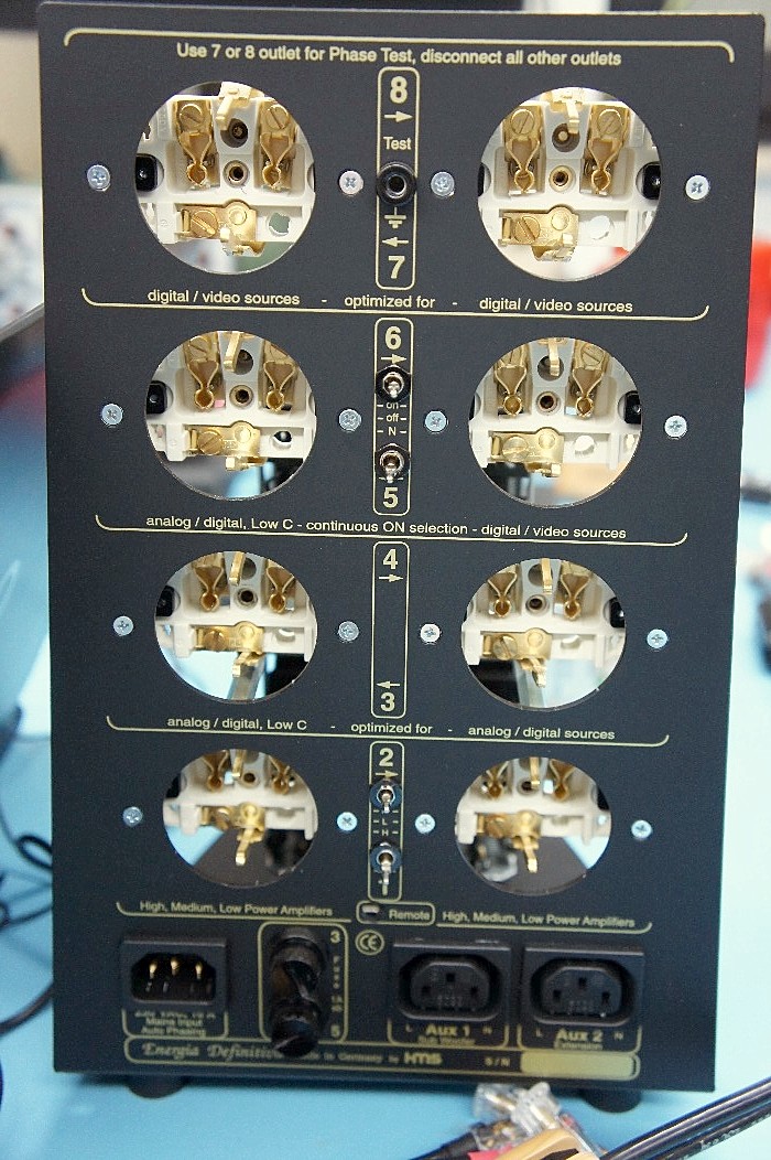 Hans M. Strassner: Die Energia RC Leisten bieten die eben genannten Funktionen in hochwertiger Ausführung in einem Gehäuse für bis zu sechs Steckplätze. Ein weiterer Aux-Steckplatz ist zur Verwendung einer weiteren gefilterten Energia-Filterleiste oder auch für Fremdfabrikate vorgesehen. Hiermit kann die Anzahl verfügbarer Steckplätze nahezu beliebig erweitert werden. Auch diese Steckplätze sind dann überspannungsgeschützt, von Gleichspannungsanteilen befreit und werden zentral, auf Wunsch optional auch mit Fernbedienung, per Softstart Ein/Aus-geschaltet. Die klangrelevantesten Komponenten sollte man jedoch aus den speziell gefilterten Schuko- und IEC-Steckplätzen der Energia RC Leiste versorgen.