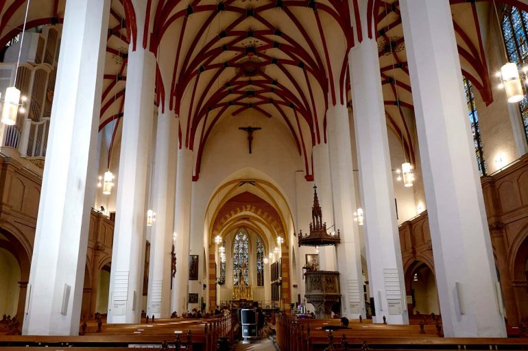 Die Wirkungsstätte Bachs waren die Hauptkirchen Leipzigs, vor allem die Thomaskirche, die seinem Job – Thomaskantor – den Namen gab. 1212 wurden Kirche, Chor und Schule gegründet, die erste Kirche stand etwas über zweihundert Jahre lang. Dann sollte ein Neubau her, da die Stadt zu einigem Wohlstand gekommen war. Ende des 15. Jahrhunderts wurde dann die neue Thomaskirche geweiht, die heute in Grundzügen immer noch in dieser Form existiert. Natürlich wurde im Laufe der Zeit viel umgebaut, namentlich eine große Renovierung im 19. Jahrhundert veränderte das Gesicht des Gotteshauses nachhaltig.