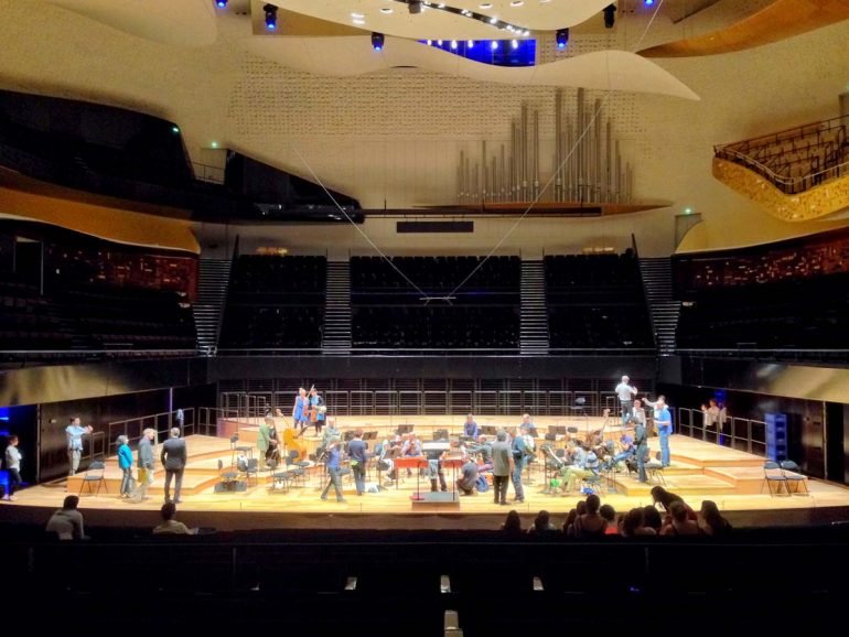 Als wir in der Pariser Philharmonie zum ersten Mal im Mai 2015 spielten, lag die Eröffnungsfeier der noch nicht lange zurück. Nach einigen Verzögerungen am Bau (das kommt also nicht nur in Berlin oder Hamburg vor) hatte man die Arbeiten auf Weisung von oben schnellstmöglich abgeschlossen – mit genau den Folgen, die man sich jetzt ausdenken kann. In den Lampen an der Decke steckten noch nicht die mittlerweile installierten LED-Strahler, sondern konventionelle Scheinwerfer, die den Bühnenraum unerträglich aufheizten.
