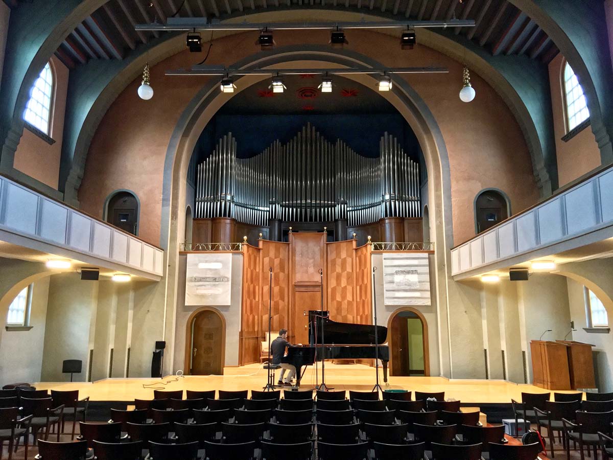 Das im neoklassischen Stil gehaltene, im Jahre 1926 eröffnete Gebäude beherbergte eigentlich eine Kirchengemeinde, die „Erste Kirche Christi, Wissenschaftler“, der das Haus bis heute gehört. Nachdem dieser Raum in bester Lage – mitten im Museumsquartier am Helvetiaplatz – der Öffentlichkeit längere Zeit nicht zugänglich war, konnte man sich in langen Gesprächen Anfang der 2000er Jahre auf einen für alle zufriedenstellenden Modus einigen und einen langfristigen Mietvertrag abschließen. Bevor der Saal allerdings 2009 seiner neuen Bestimmung übergeben werden konnte, mussten einige Umbauarbeiten vorgenommen werden. Eine konzerttaugliche Beleuchtung war natürlich sehr weit oben auf der Bedarfsliste, ebenso eine akustisch förderliche und halbwegs flexible Bühnenkonstruktion. Abgerundet wurde die Umgestaltung mit dem Kauf eines wirklich exquisiten Steinway-D-Konzertflügels. Wer auch nur ein wenig mit Klavieren zu tun hat, weiß, wie unterschiedlich diese Spezies ausfallen können und wie wichtig es folglich ist, ein wirklich gutes Exemplar zu ergattern, um einen Saal zum beliebten Ziel der weltweit reisenden Virtuosen zu machen. Hier hat man alles richtig gemacht und seit dem Kauf die Pflege dieses Schatzes nur einer Firma anvertraut, was bedeutet, dass es sich nun um einen sehr „entspannten“ Flügel handelt. Jeder Klavierbauer hat eine eigene Art, das Instrument zu stimmen und zu intonieren. Wenn ein Flügel über Jahre wöchentlich von unterschiedlichen Menschen in unterschiedliche Richtungen gezerrt wird, setzt das ein Instrument unter Stress, und das hört man.