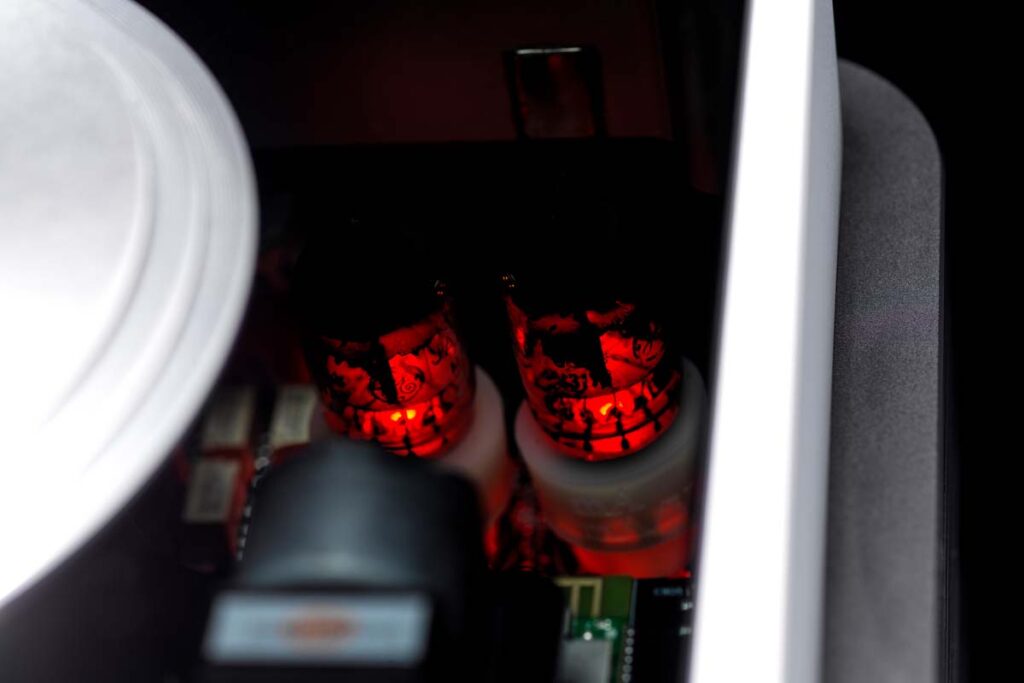 In der Transistorversion beispielsweise höre ich einen Livemitschnitt einer Rossinioper sehr klar und sauber eingeteilt. Die Sänger stehen penibel voneinander abgegrenzt auf der Bühne, das Orchester davor wird präzise bis in die hinteren Pulte durchleuchtet. Schalte ich auf „Tube“ um, verändert sich fast alles. Die Bühne wird weiter, vor allem aber deutlich tiefer. Die Sänger sind nicht mehr so klar lokalisierbar, bespielen aber mehr Raum. Die Stimmen kommen nun etwas fleischiger aus den Membranen, der minimale Verlust an Artikulation ist zu verschmerzen. Auf „Tube+“ gewechselt, verstärkt sich das Bild. Alles wird golden, charmant, weit, schön. So schön.