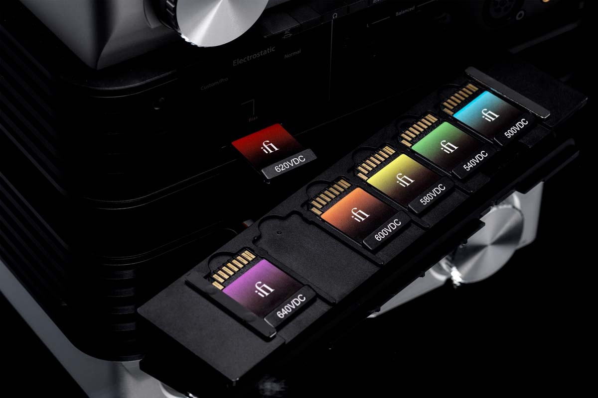 Anschlussseitig gibt es alles, was man sich erträumen könnte. Kopfhörer lassen sich über die üblichen Klinken, kleine Klinken in 3,5- und 4,4-Millimeter-Ausführung sowie symmetrische Anschlüsse verbinden. Elektrostaten kann man über vier- oder fünfpolige Buchsen betreiben. Die Rückseite bietet symmetrische und unsymmetrische Eingänge sowie auch – und jetzt wird es noch spannender – einen properen Vorstufenausgang, wiederum als XLR- oder Cinchbuchse ausgeführt. Man kann den Phantom also auch als veritablen Vorverstärker nutzen. Hinter einer kleinen Magnetplatte sind dann sechs SD-Karten versteckt, mittels derer man die Vorspannung für die angeschlossenen Elektrostaten passgenau justieren kann. Wirkt zunächst umständlich, ist aber eigentlich ziemlich smart, denn so kann man nicht aus Versehen die Werte verstellen und damit dem Kopfhörer schaden. Klanglich lässt sich der iFi Phantom nur sehr schwer greifen. Die vielen, miteinander kombinierbaren Einstellmöglichkeiten eröffnen so unglaublich viele, grundverschiedene Klänge, dass man kaum von dem einen Sound reden kann. Allgemein lässt sich festhalten, dass alle Züge sehr solide und sauber agieren, hier wurde mit sehr viel Sachverstand gearbeitet.