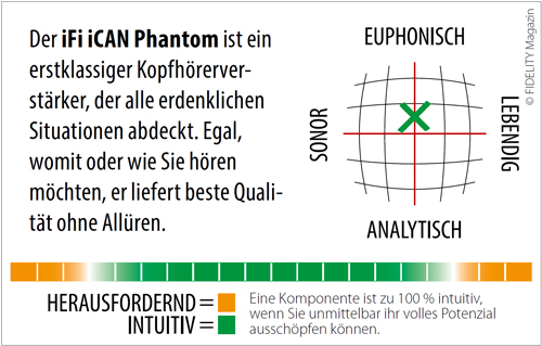 Richtig kompliziert wird es, wenn wir uns eingestehen, dass wir nicht immer in der gleichen Stimmung sind und daher auch nicht immer gleich hören. Es wird also immer schlimmer. Eine Lösung dafür heißt „Zweitanlage“. Nicht umsonst stehen bei mir in mehreren Zimmern Setups, die durchaus unterschiedlich tönen. Das bedarf aber eines gewissen Aufwands, was finanziellen Input, Platzbedarf und Leidensfähigkeit des Partners betreffen. Eine weitaus elegantere Lösung bietet jetzt iFi Audio mit dem Kopfhörerverstärker iCAN Phantom. Nun gut, ein Schnäppchen ist auch dieser Kollege nicht, allerdings kann er sämtliche Entscheidungsfragen beim Neukauf sehr entspannt mit einem Ja beantworten.