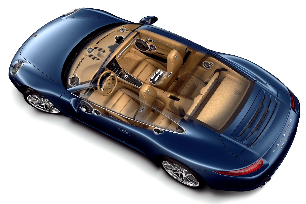 Das Burmester Sound System feiert in den Modellen Panamera und Cayenne enorme Erfolge, nicht zuletzt aufgrund relativ großzügiger Platzverhältnisse. Beim 911 aber galt es, einen echten Sportwagen mit großem High-End-Klang auszustatten. Geradezu genial gelang hierbei die Integration des leistungsstarken Subwoofers: Dessen Arbeitsvolumen ist bereits in den Rohbau der Karosserie integriert, benötigt daher kein extra Gehäuse und spart ein paar wichtige Kilos. Überhaupt spielt das Gewicht eine entscheidende Rolle. Burmester, Renz und Leßlich schafften es schließlich, ein Rundum-Paket von nur 6,5 kg zu schnüren. Darin enthalten sind nicht weniger als ein Dutzend Chassis: jedes vom eigenen Verstärker angetrieben, akustisch extrem sorgfältig positioniert (ein gern vernachlässigtes Thema) und neben allen Messprüfungen vom Meister selbst feinabgestimmt. Daher sind auch hier Air-Motion-Hochtöner und klassische Endstufentechnik an Bord: Mit diesen Ingredienzen, die in ganz ähnlicher Form ja auch in seinen Heimsystemen zu finden sind, so Burmester, klinge es einfach um den entscheidenden Kick besser.